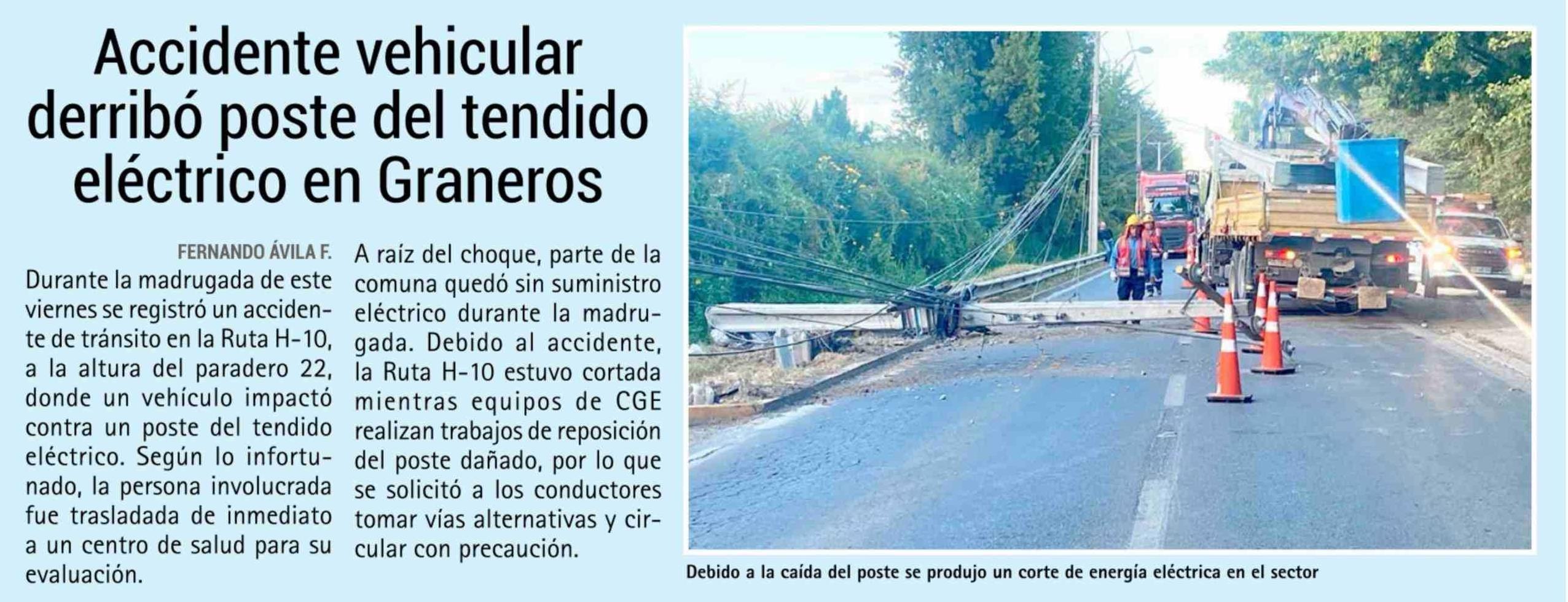 Accidente vehicular derribó poste del tendido eléctrico en Graneros 27-02-2026 El Rancagüino |