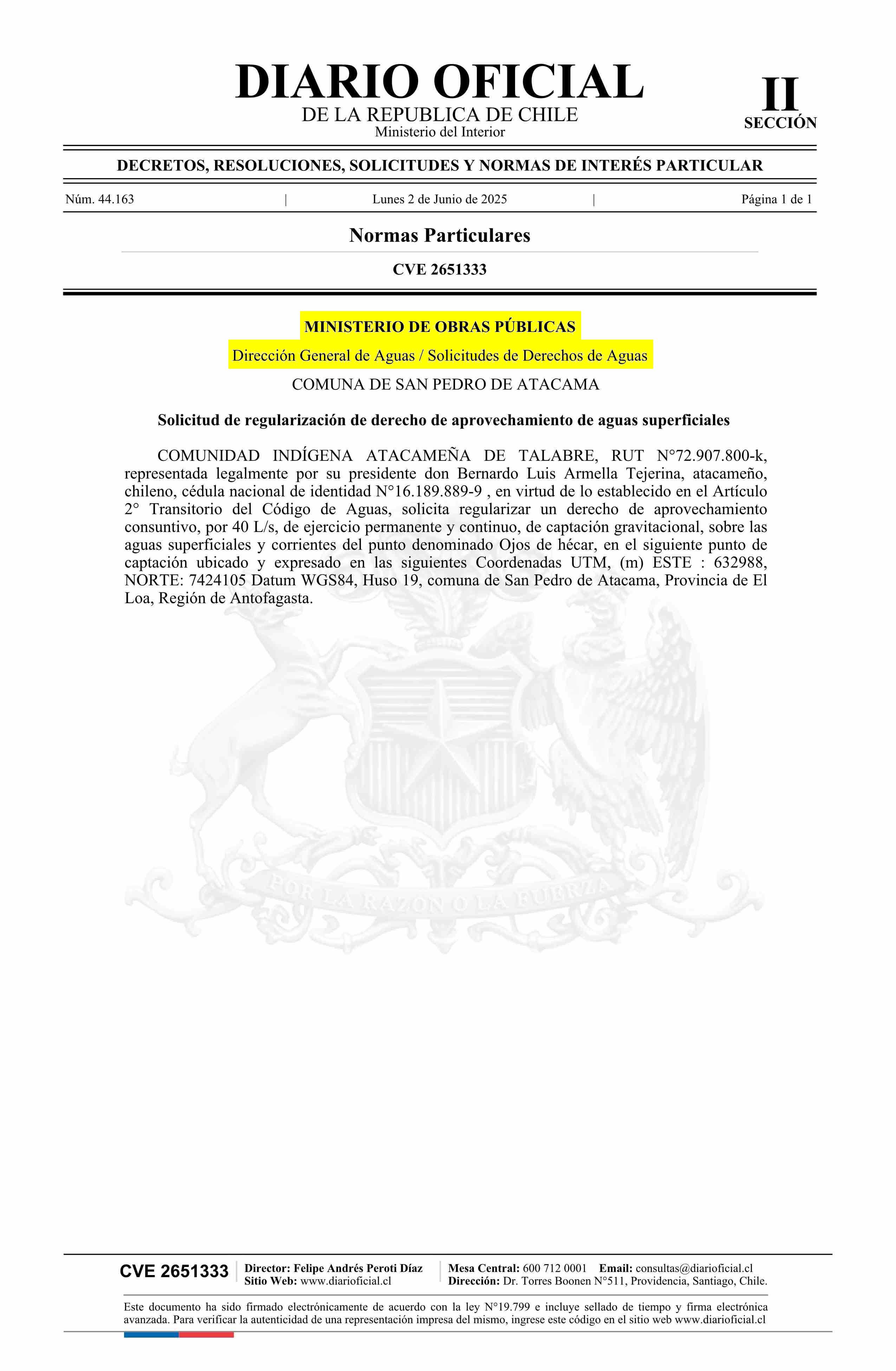 Solicitud Comunidad Indígena Atacameña de Talabre 02-06-2025 Diario Oficial Edición Electrónica |