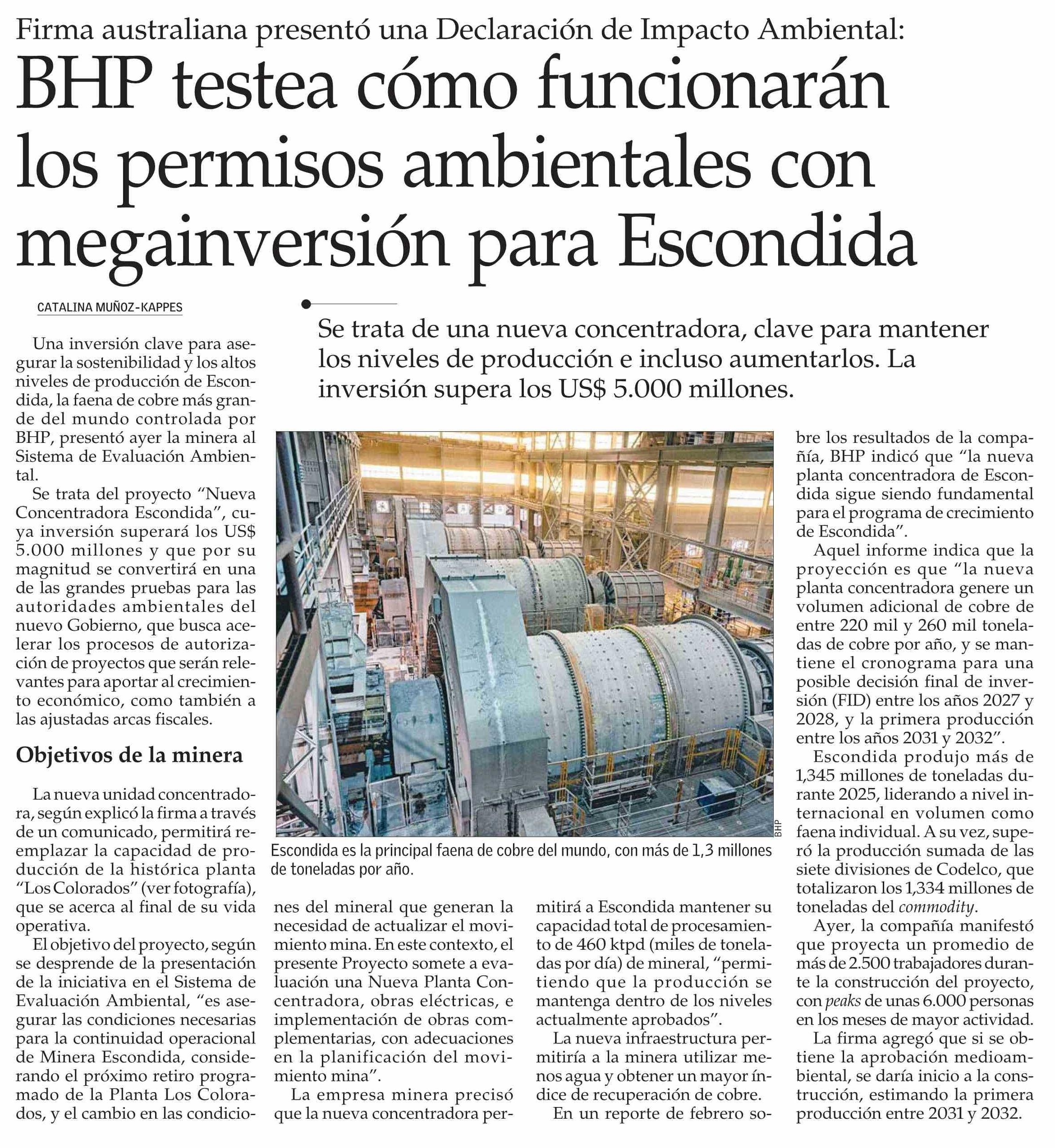 BHP testea cómo funcionarán los permisos ambientales con megainversión para Escondida 17-03-2026 El Mercurio |