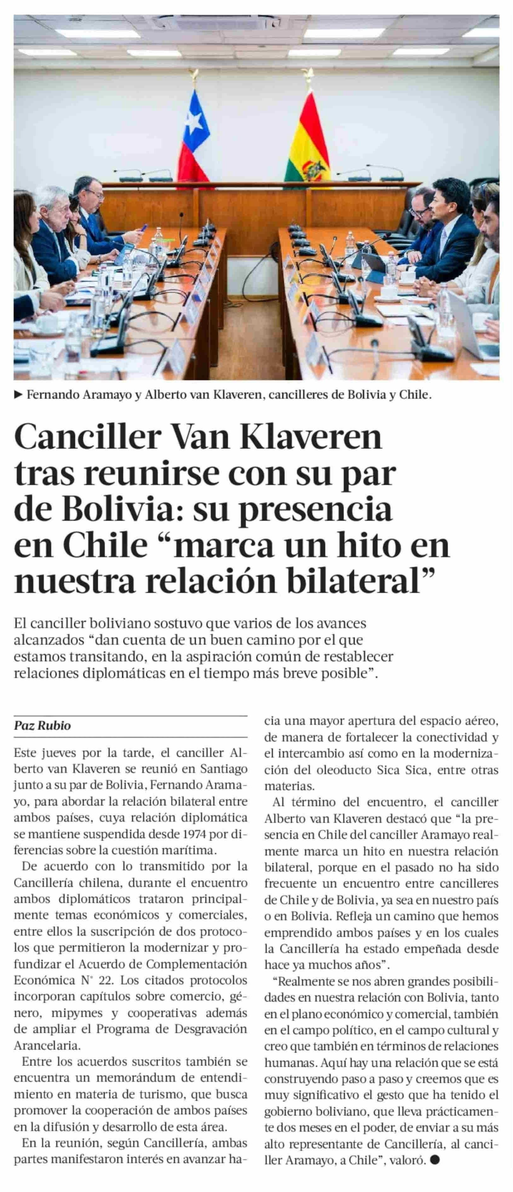 Canciller Van Klaveren tras reunirse con su par de Bolivia: su presencia en Chile "marca un hito en nuestra relación bilateral" 16-01-2026 La Tercera |