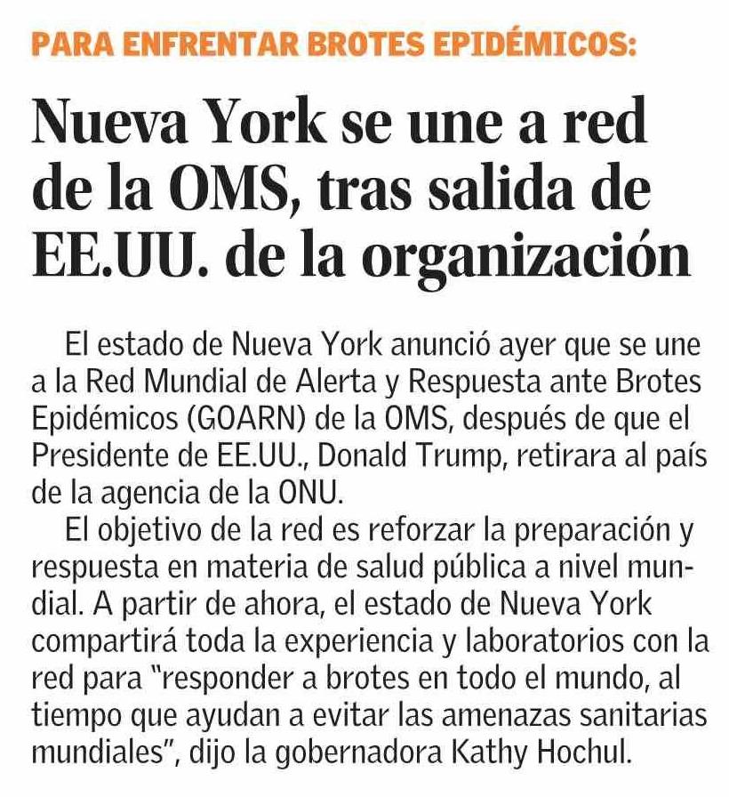 Título: Nueva York se une a red de la OMS, tras salida de EE.UU. de la organización