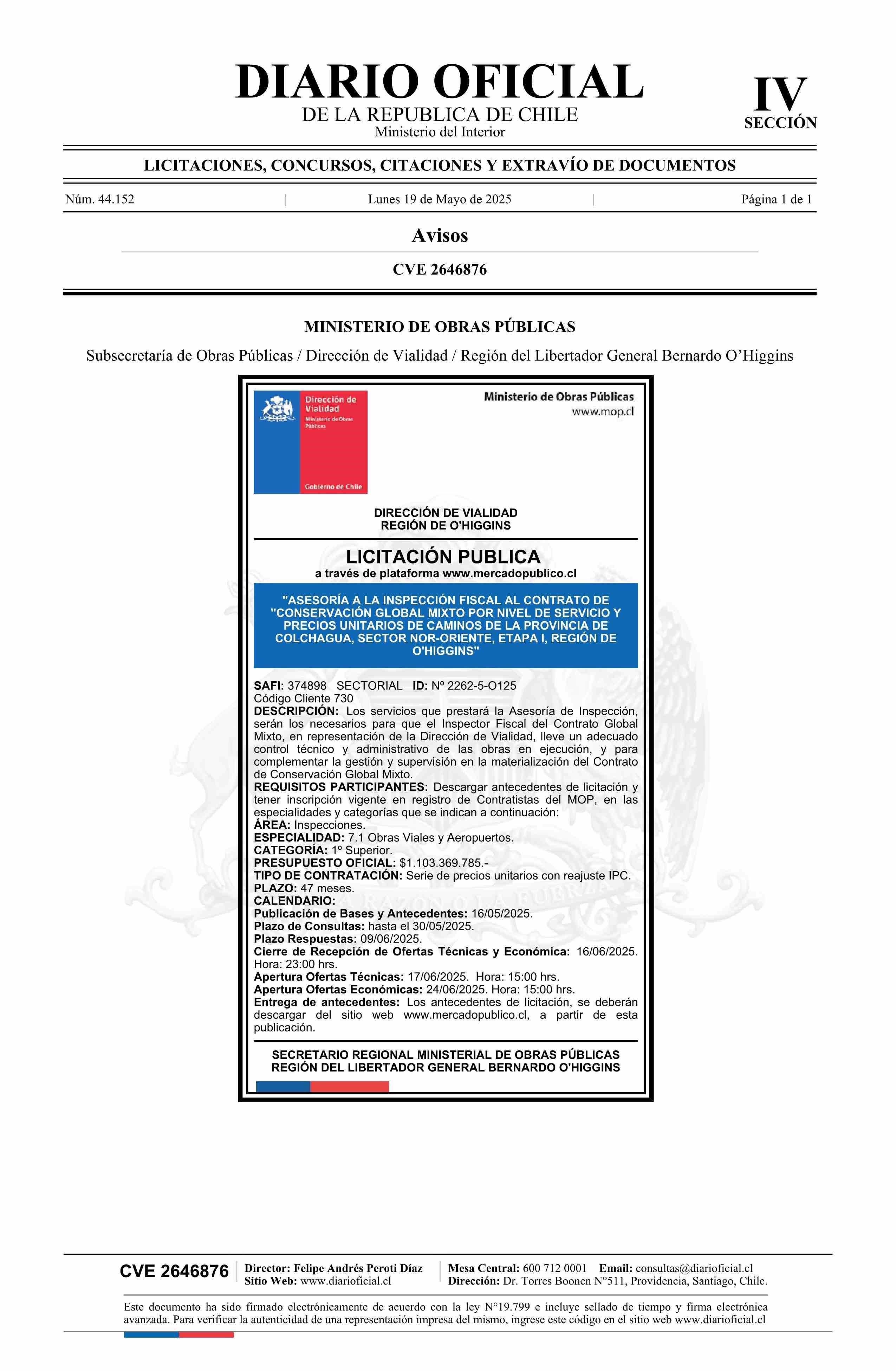 | Título: | AVISO LICITACIONES: Asesoría a la Inspección Fiscal al Contrato de Conservación Global Mixto por Nivel de Servicio y Precios Unitarios de Caminos de la Provincia de Colchagua, Sector Nor-Oriente, Etapa I, Región de O'Higgins |