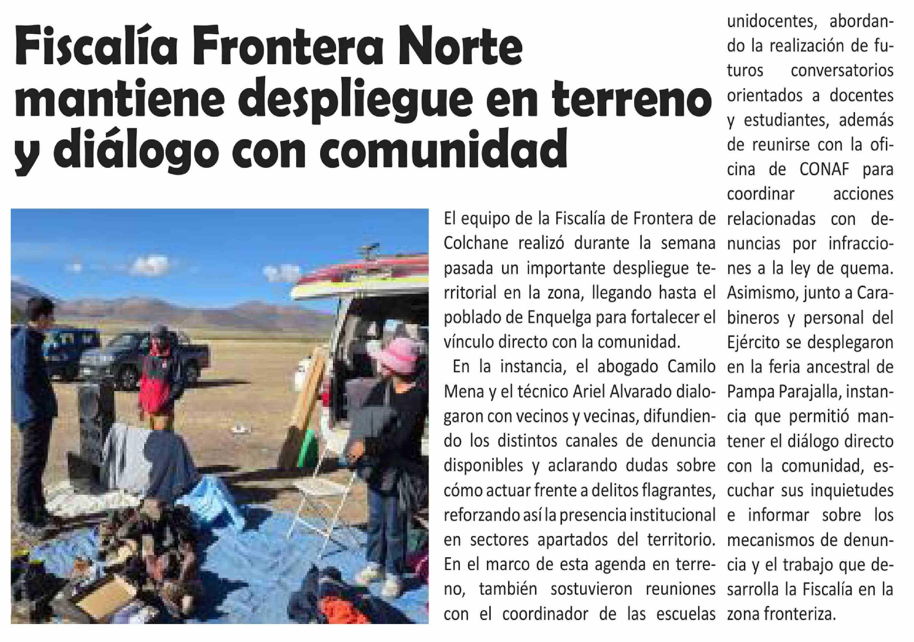 | Título: | Fiscalía Frontera Norte mantiene despliegue en terreno y diálogo con comunidad |