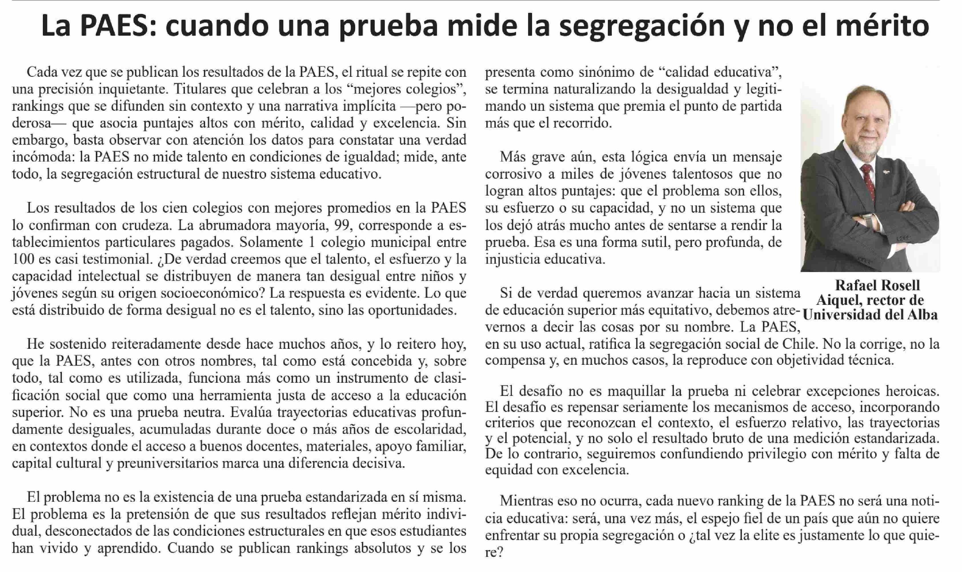 | Título: | Columnas de Opinión: La PAES: cuando una prueba mide la segregación y no el mérito |