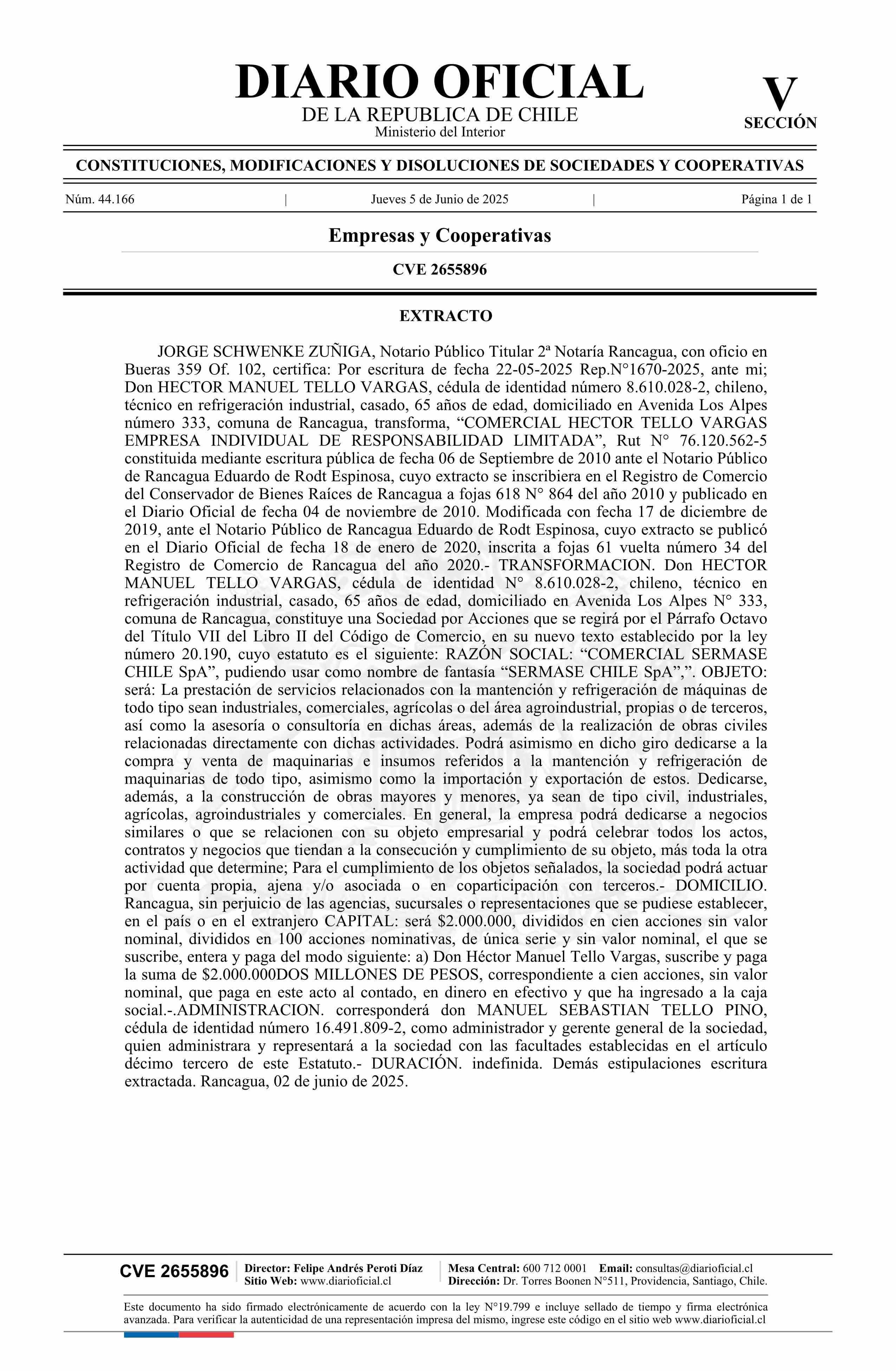 COMERCIAL HECTOR TELLO VARGAS EMPRESA INDIVIDUAL DE RESPONSABILIDAD LIMITADA 76.120.562-5* 05-06-2025 Diario Oficial Edición Electrónica |