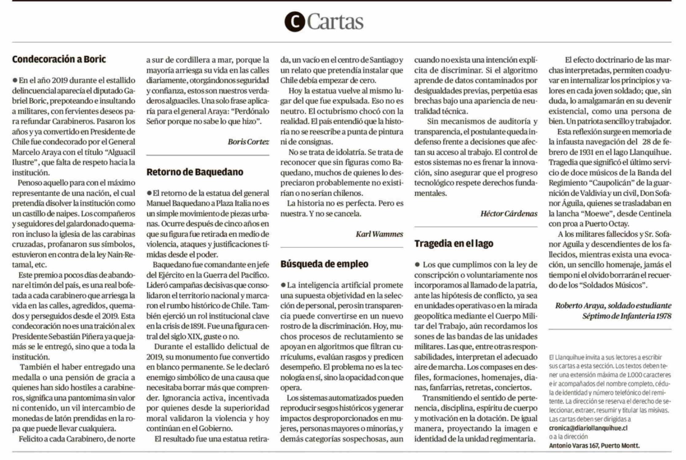 | Título: | Cartas: · En el año 2019 durante el estallido delincuencial aparecía el diputado Gabriel Boric, prepoteando e insultando a militares, con fervientes deseos para refundar Carabineros. Pasaron los años y ya convertido en Presidente de Chile fue condecorado por el General Marcelo Araya con el título "A |