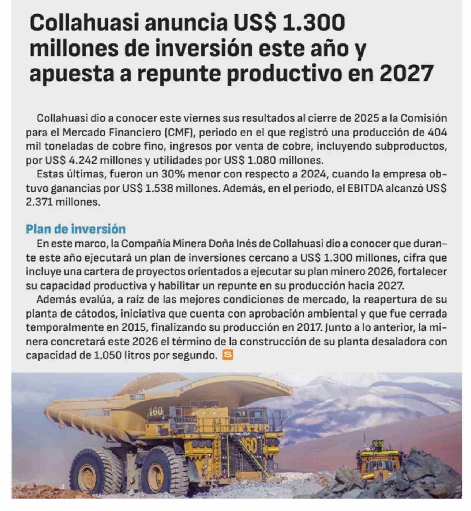 Collahuasi anuncia US$ 1.300 millones de inversión este año y apuesta a repunte productivo en 2027 28-02-2026 Diario Financiero |
