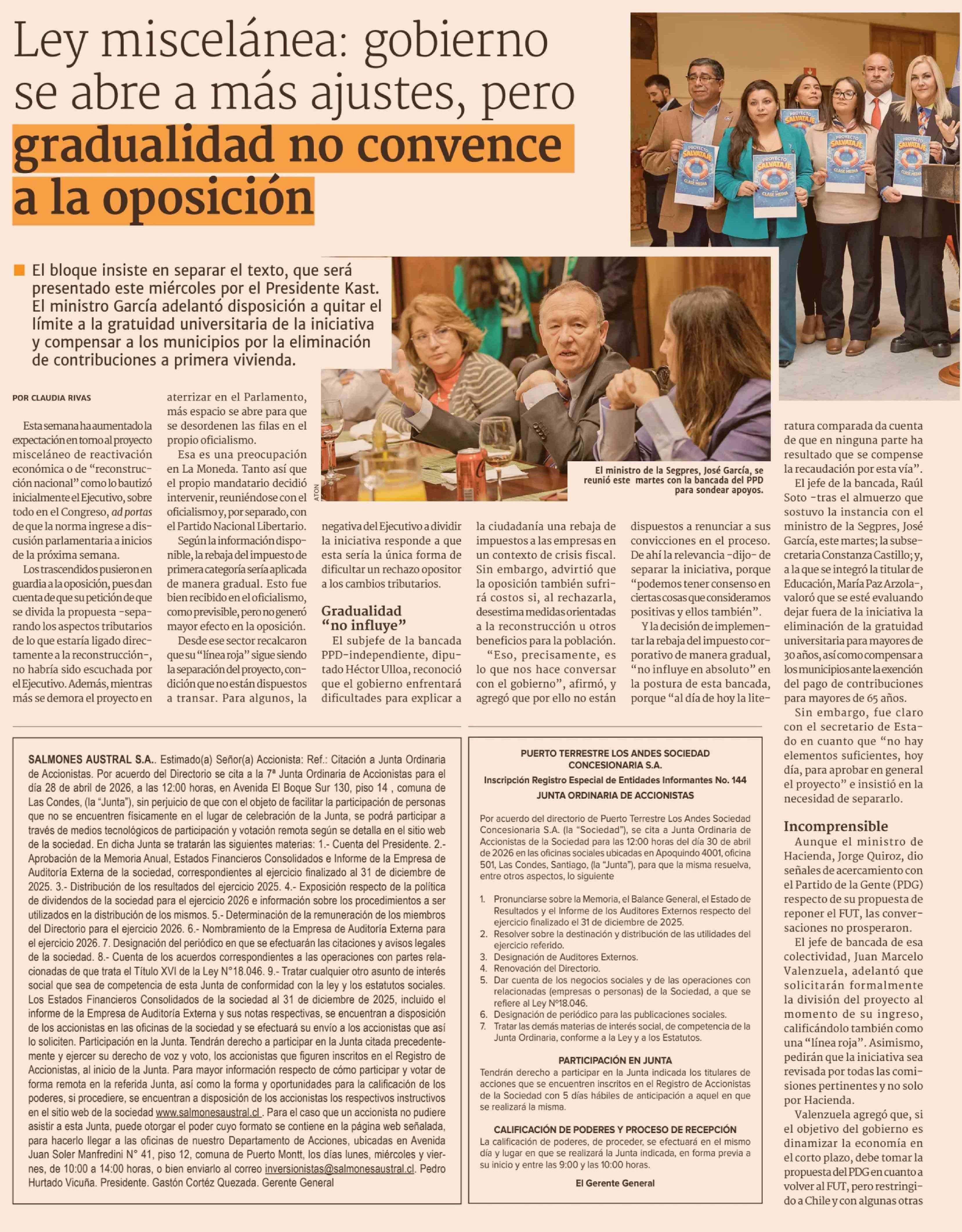 Ley miscelánea: gobierno se abre a más ajustes, pero gradualidad no convence a la oposición 15-04-2026 Diario Financiero |