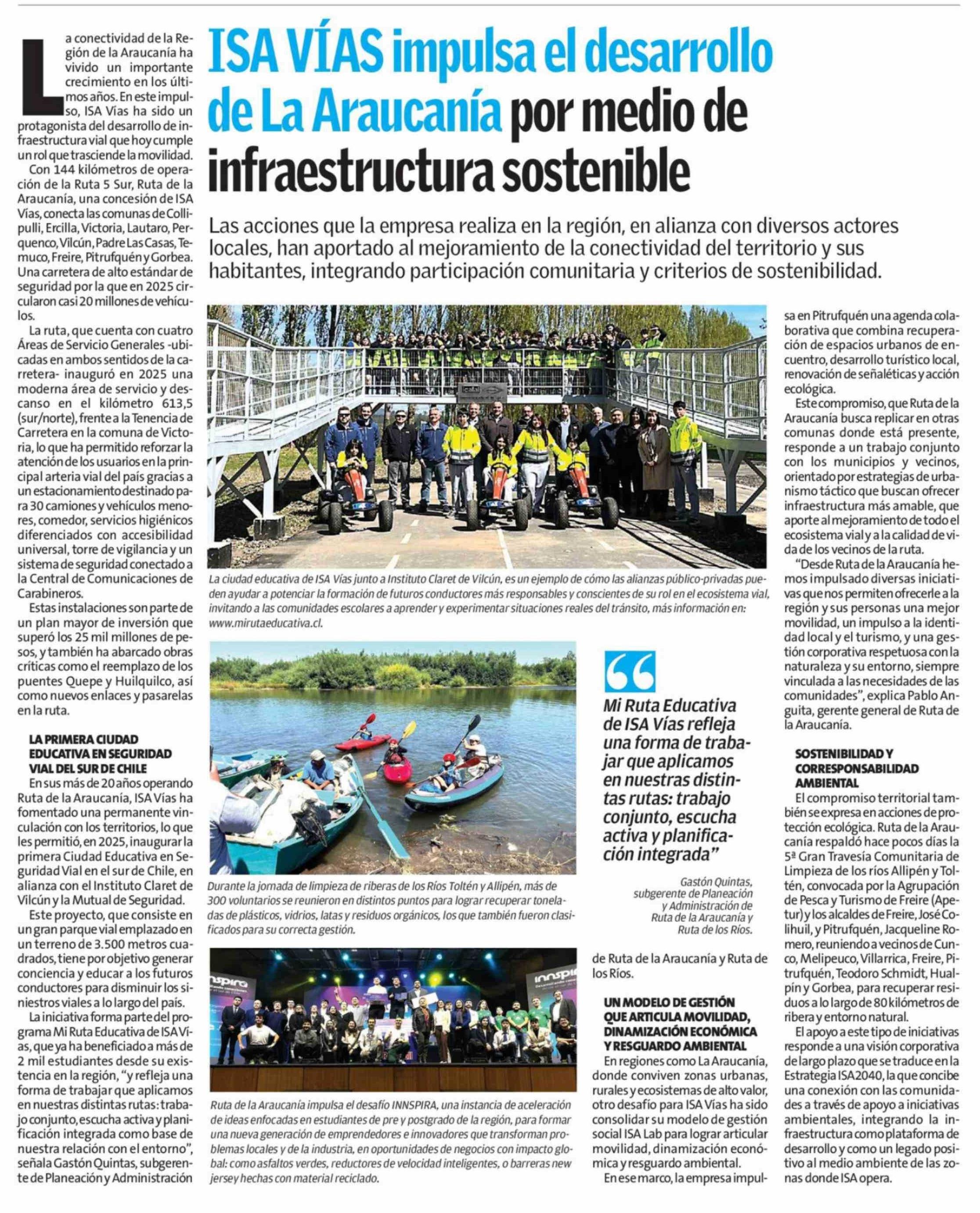 ISA VÍAS impulsa el desarrollo de La Araucanía por medio de infraestructura sostenible 30-03-2026 El Austral de la Araucanía |