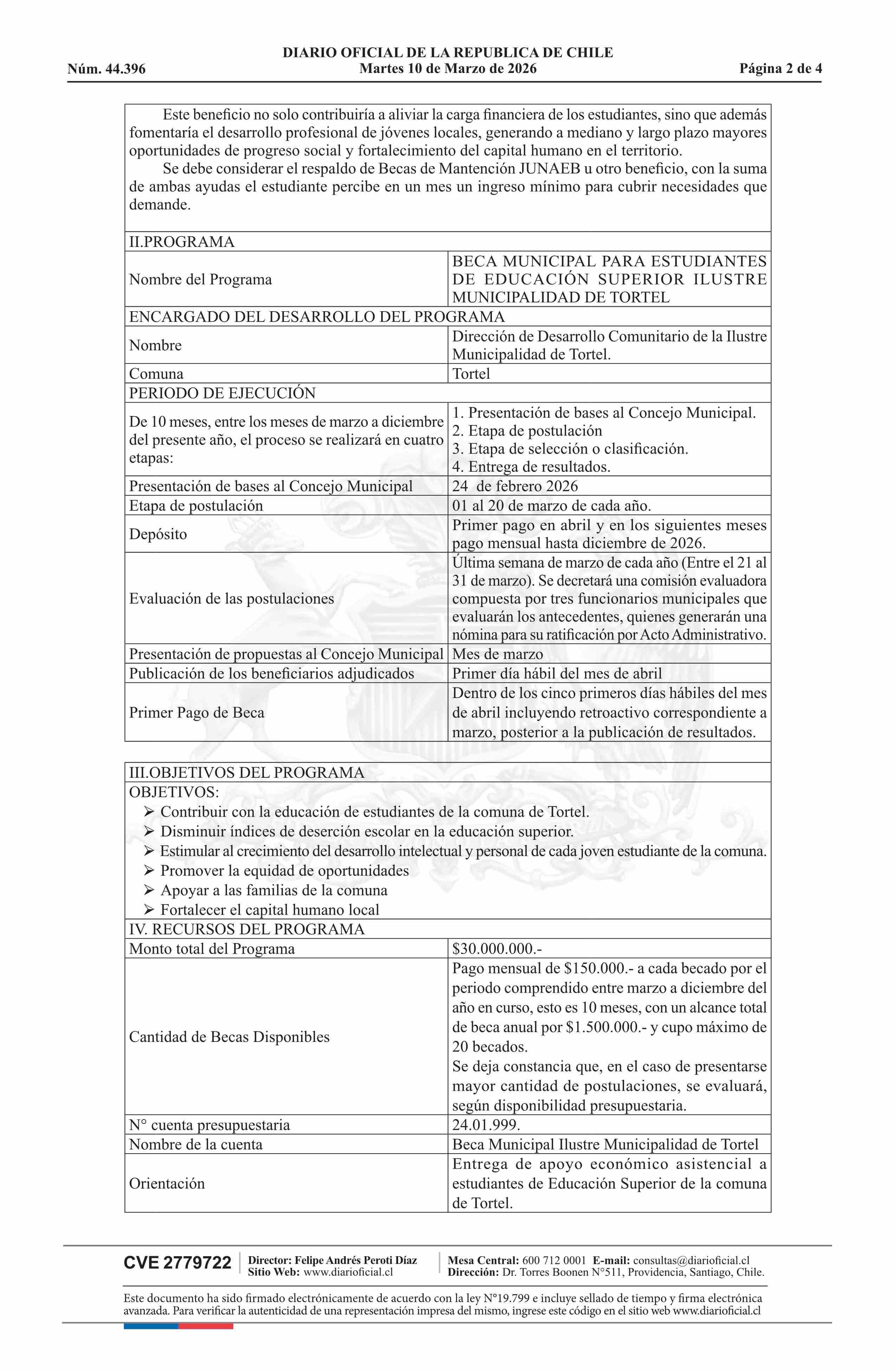 Título: Decreto alcaldicio exento número 156, de 2026.- Aprueba Ordenanza de Beca Municipal Educación Superior Ilustre Municipalidad de Tortel