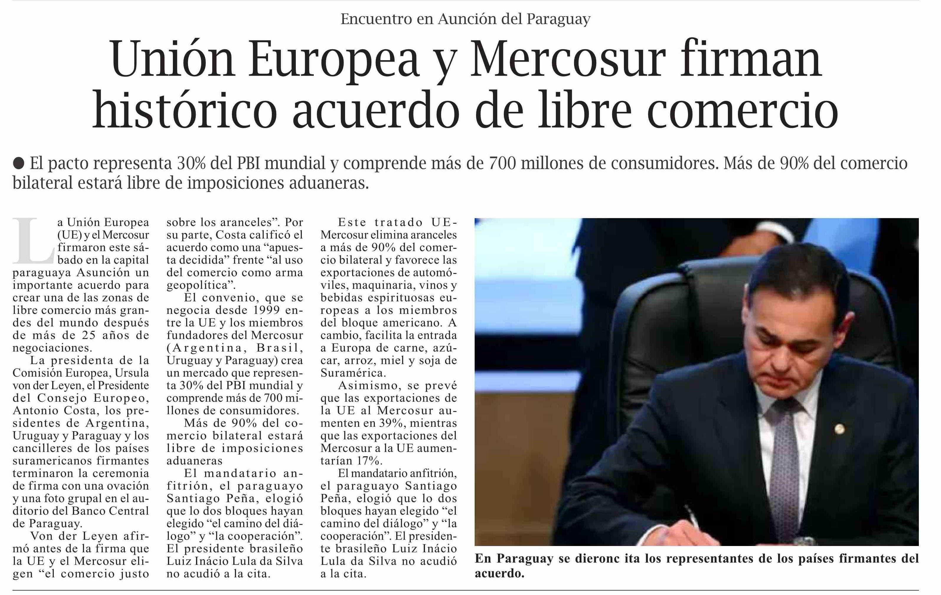 | Título: | Unión Europea y Mercosur firman histórico acuerdo de libre comercio |