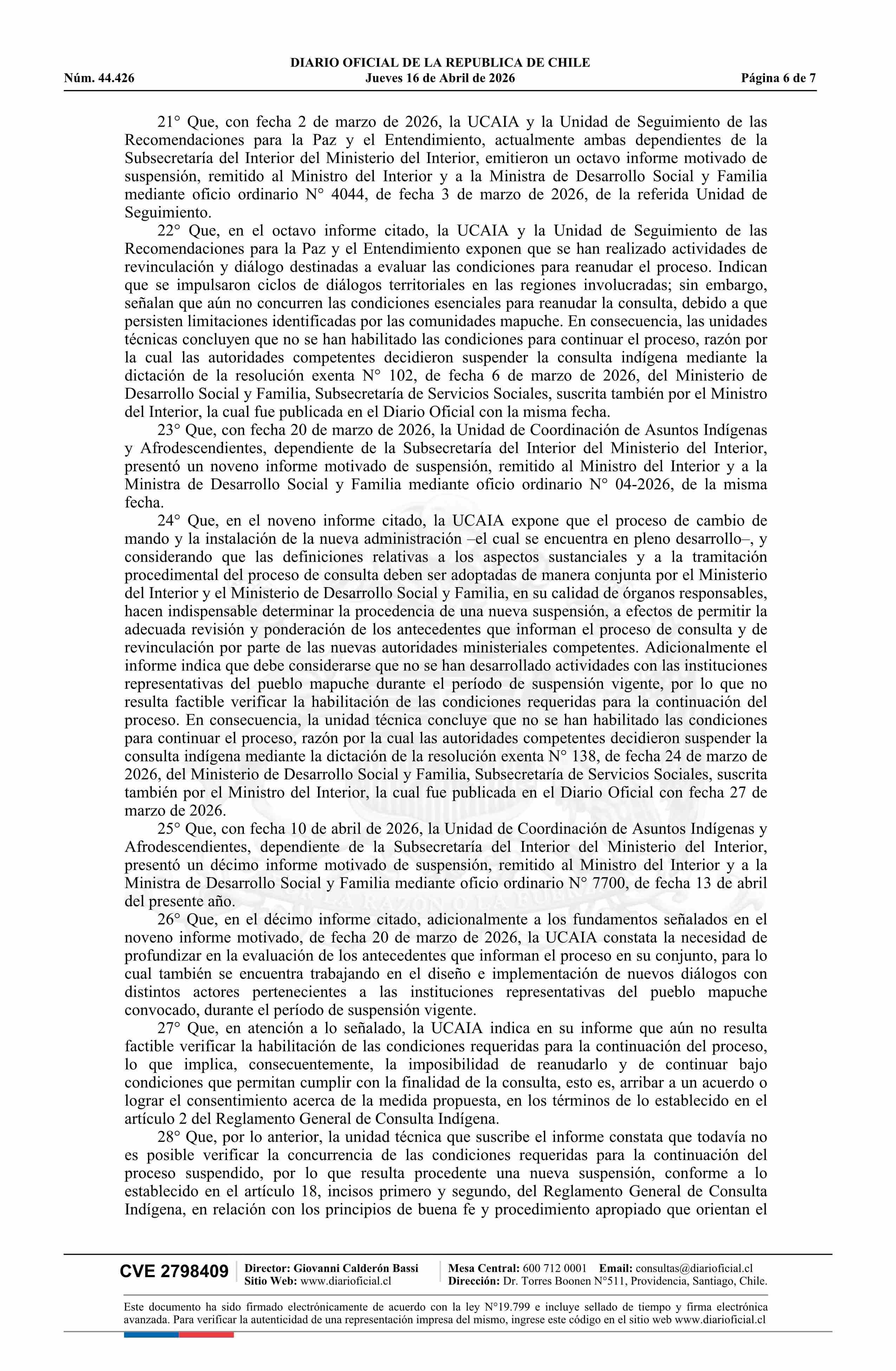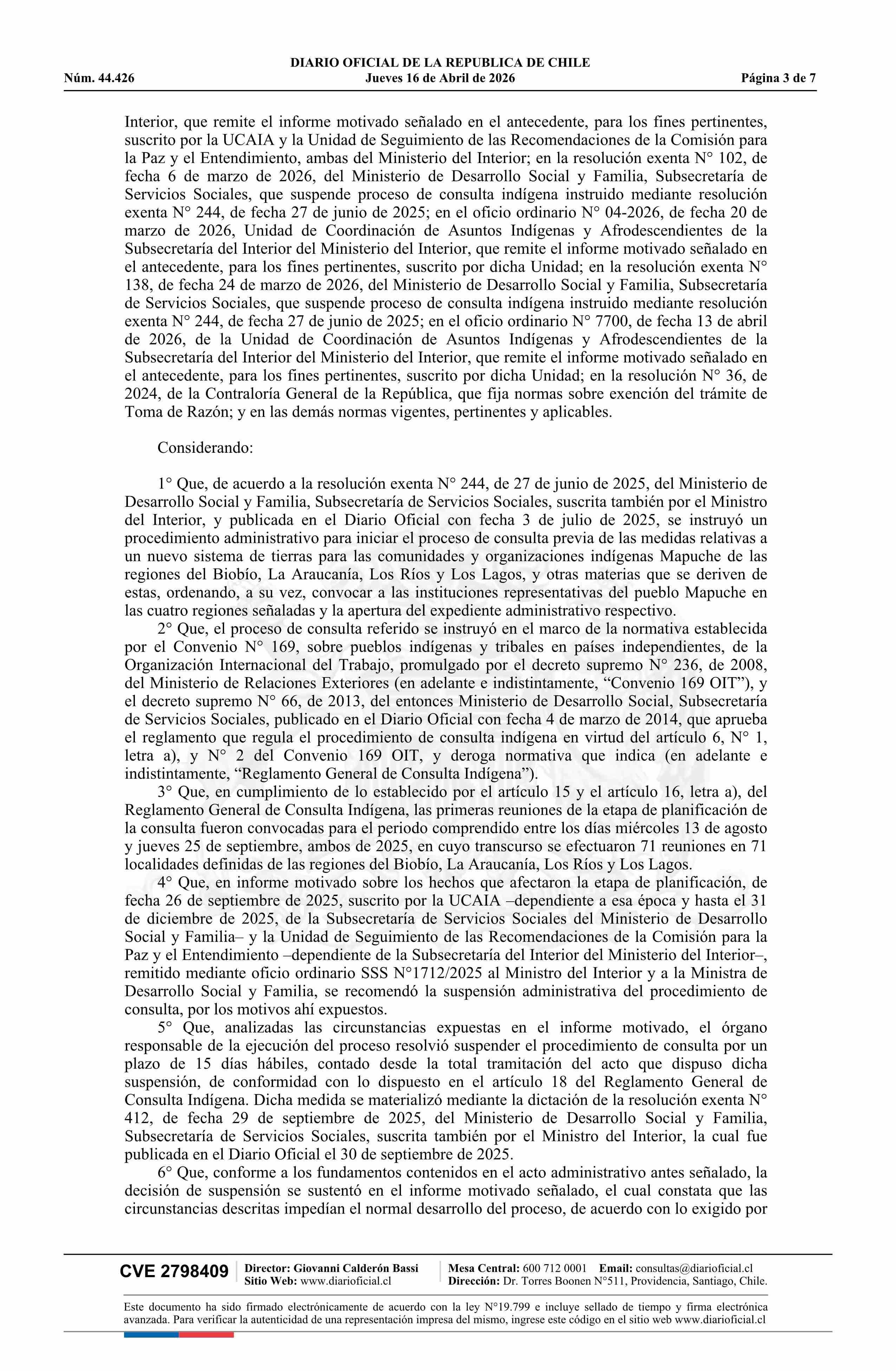 | Título: | Resolución exenta número 147, de 2026.- Suspende proceso de consulta indígena instruido mediante resolución N° 244 exenta, de 2025, por motivos que indica |