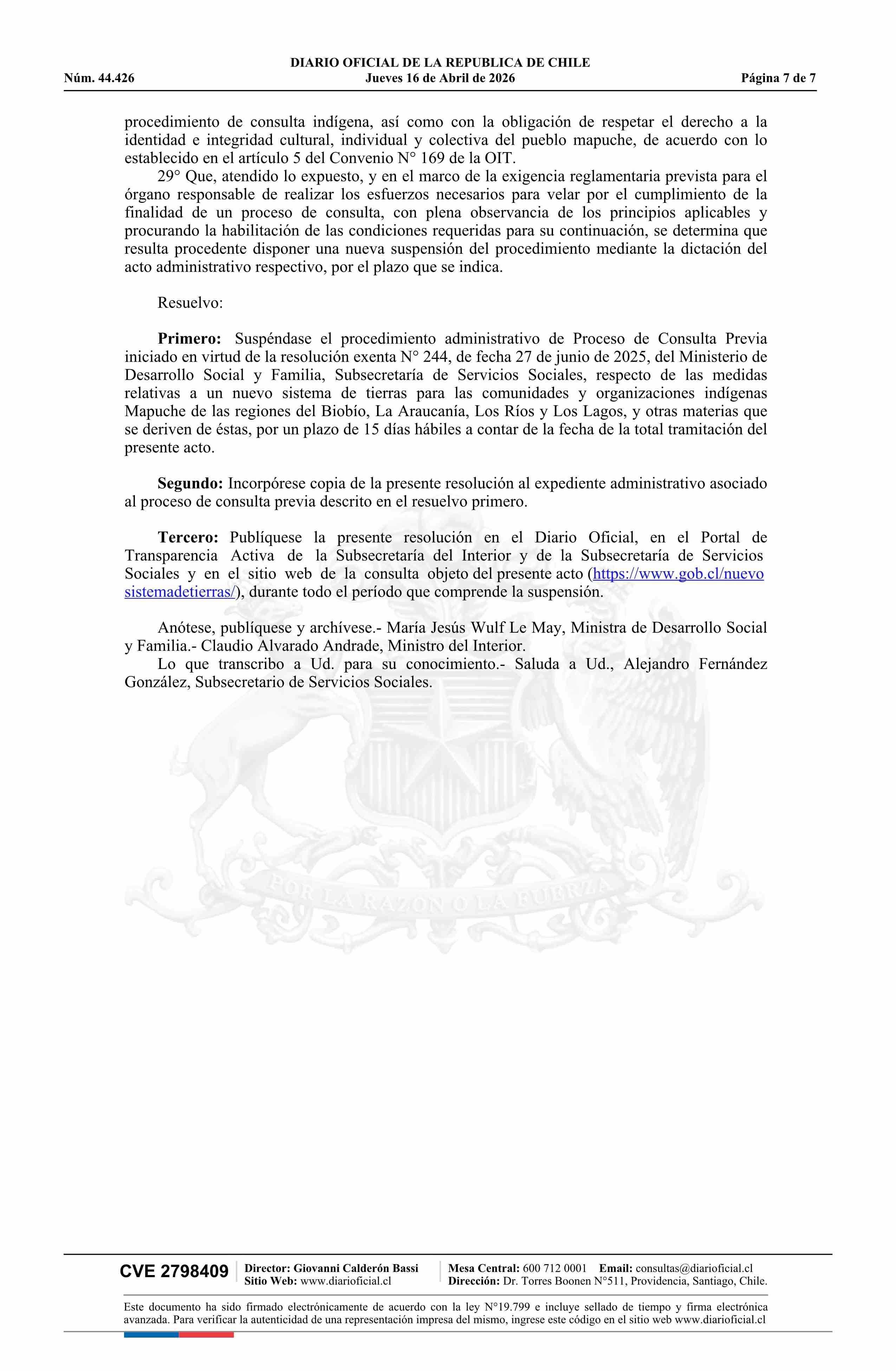 Resolución exenta número 147, de 2026.- Suspende proceso de consulta indígena instruido mediante resolución N° 244 exenta, de 2025, por motivos que indica 16-04-2026 Diario Oficial Edición Electrónica |