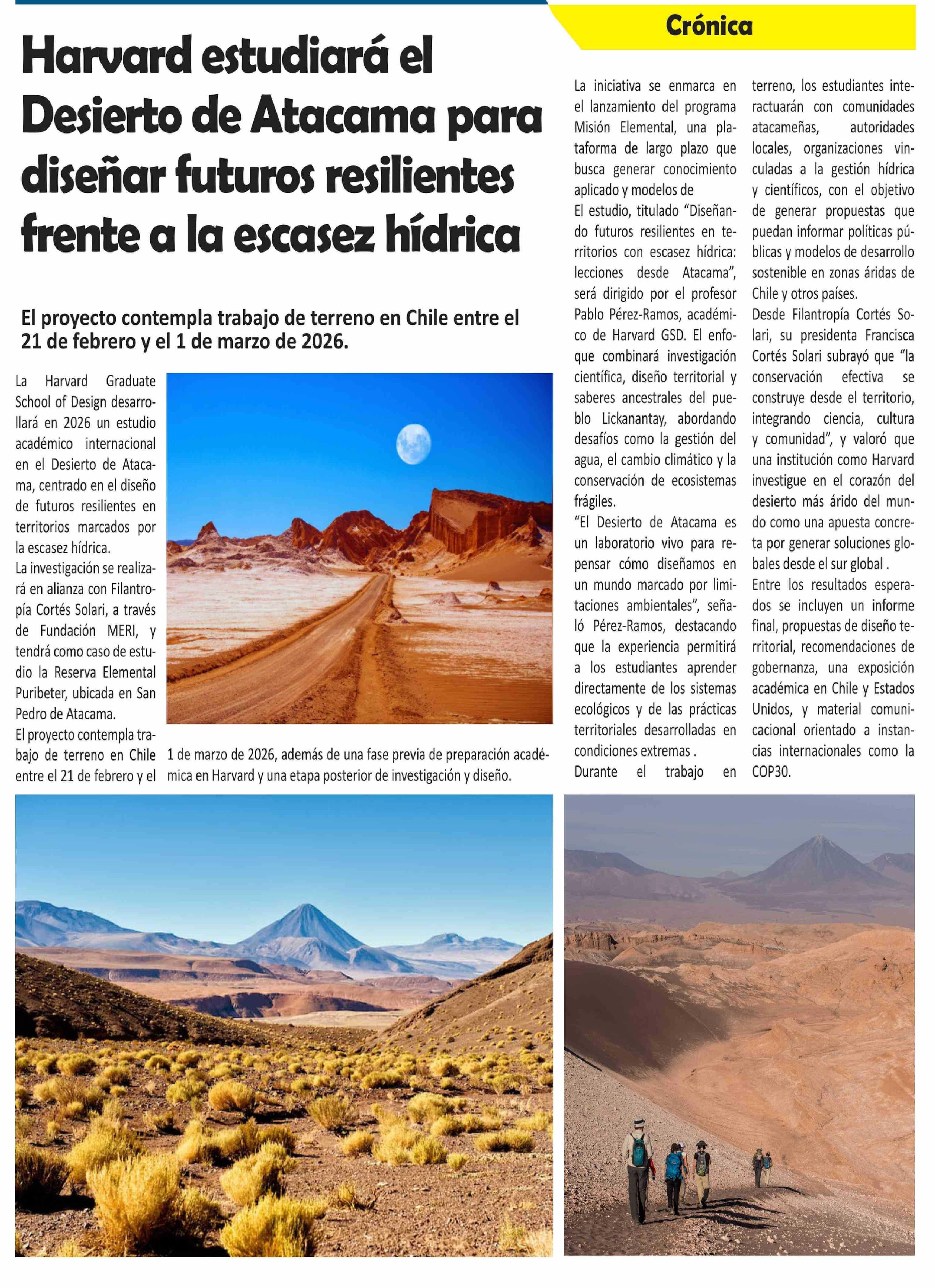 | Título: | Harvard estudiará el Desierto de Atacama para diseñar futuros resilientes frente a la escasez hídrica |