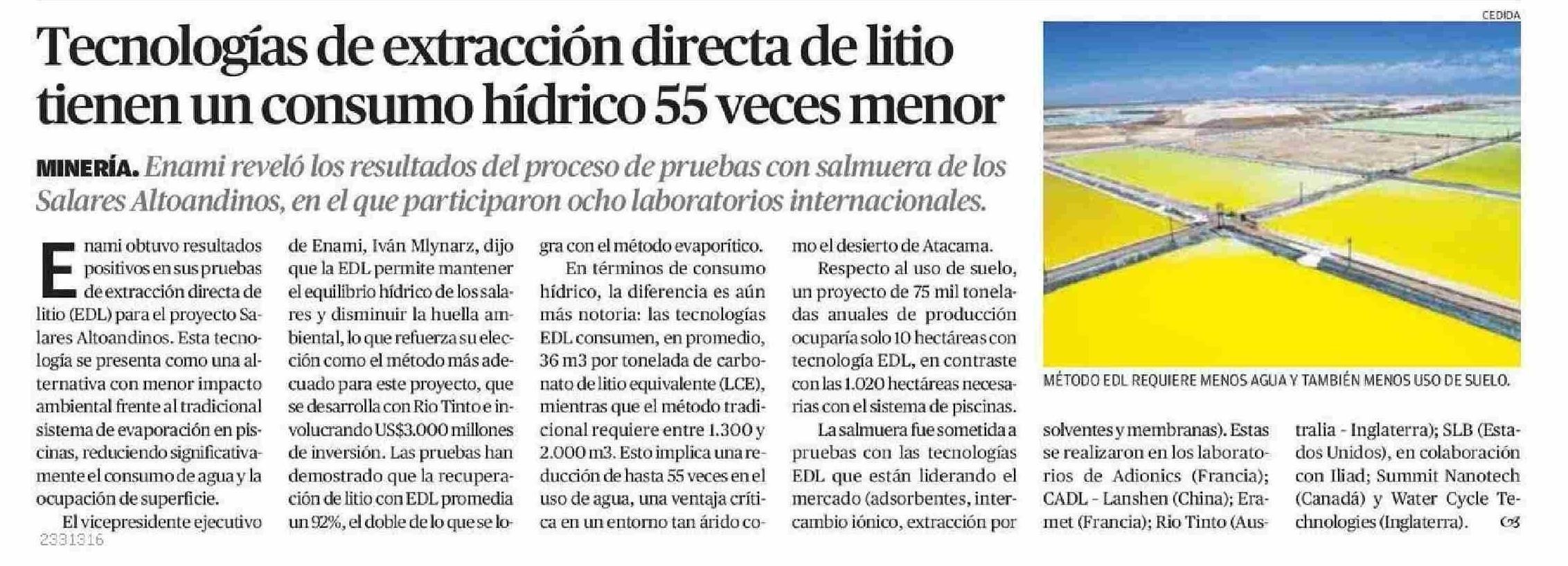 Tecnologías de extracción directa de litio tienen un consumo hídrico 55 veces menor 10-06-2025 El Mercurio de Calama |