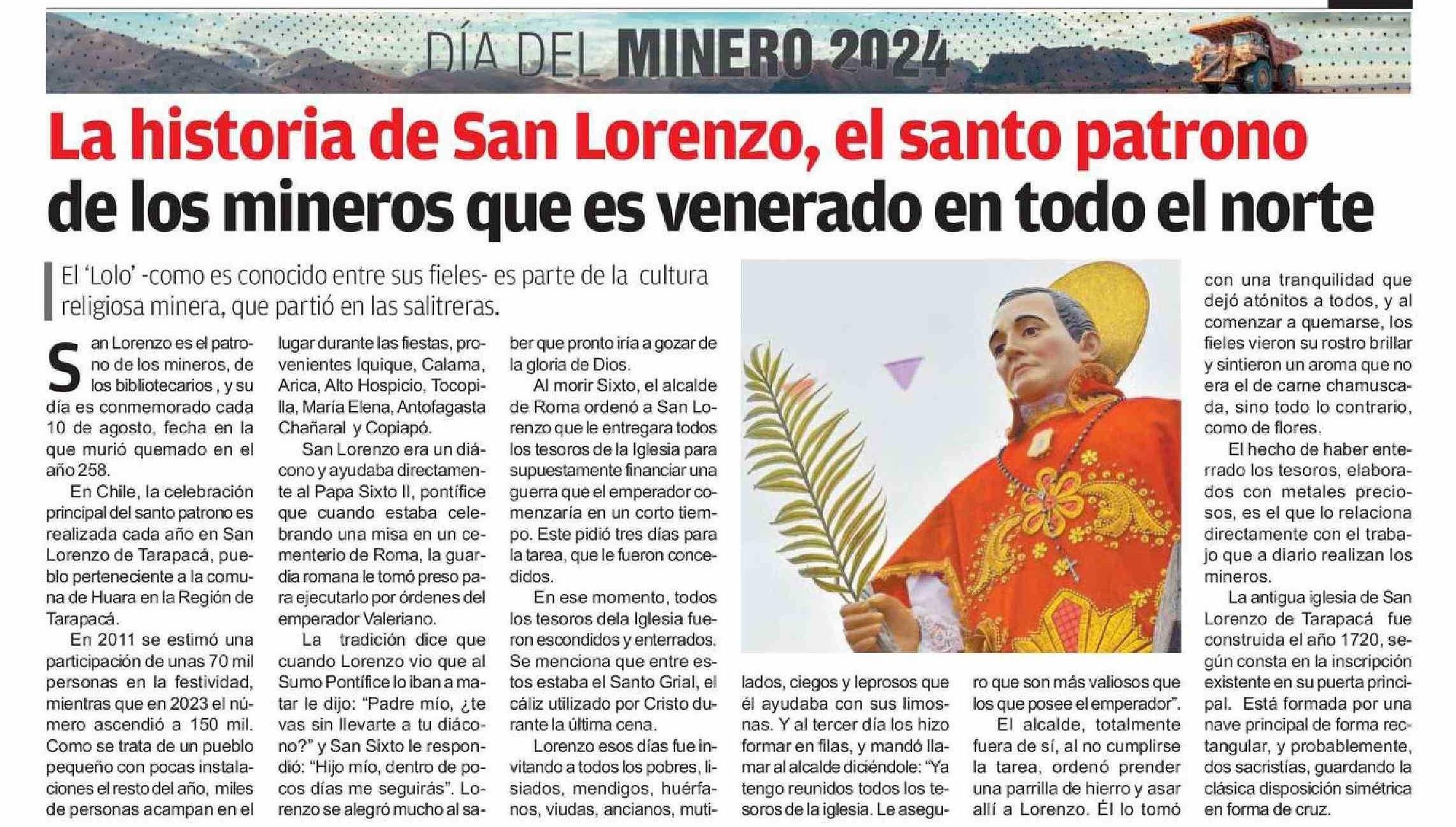 La historia de San Lorenzo, el santo patrono de los mineros que es venerado en todo el norte 10-08-2024 La Estrella de Antofagasta |