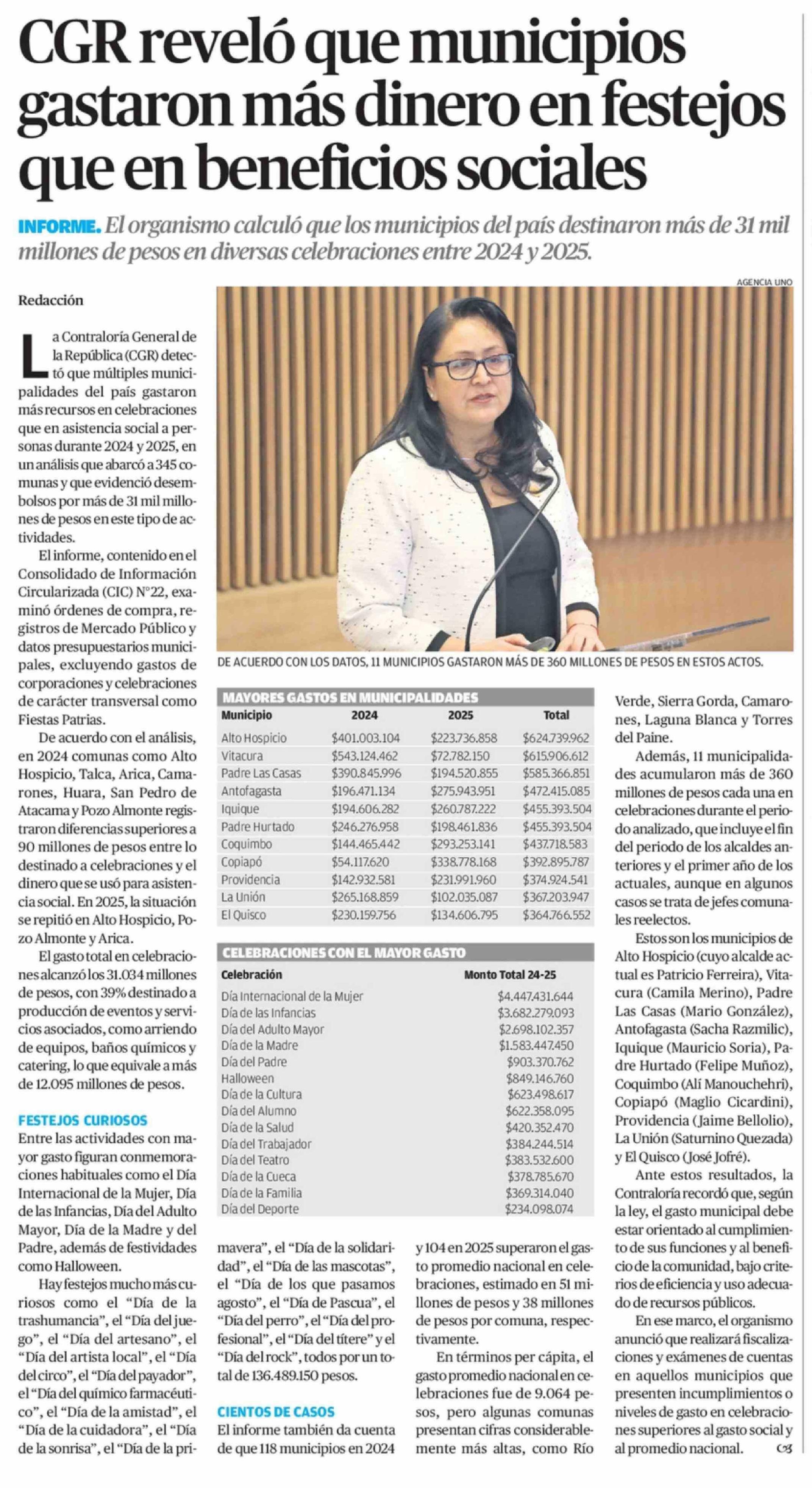 Título: CGR reveló que municipios gastaron más dinero en festejos que en beneficios sociales