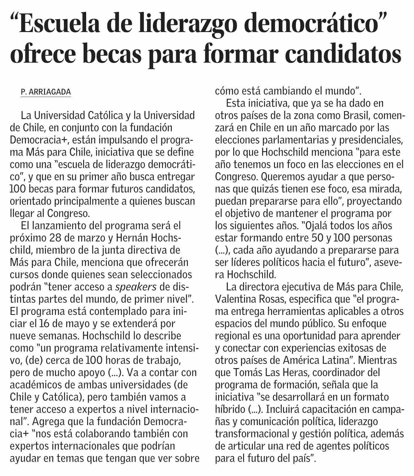 “Escuela de liderazgo democrático” ofrece becas para formar candidatos 15-03-2025 El Mercurio |