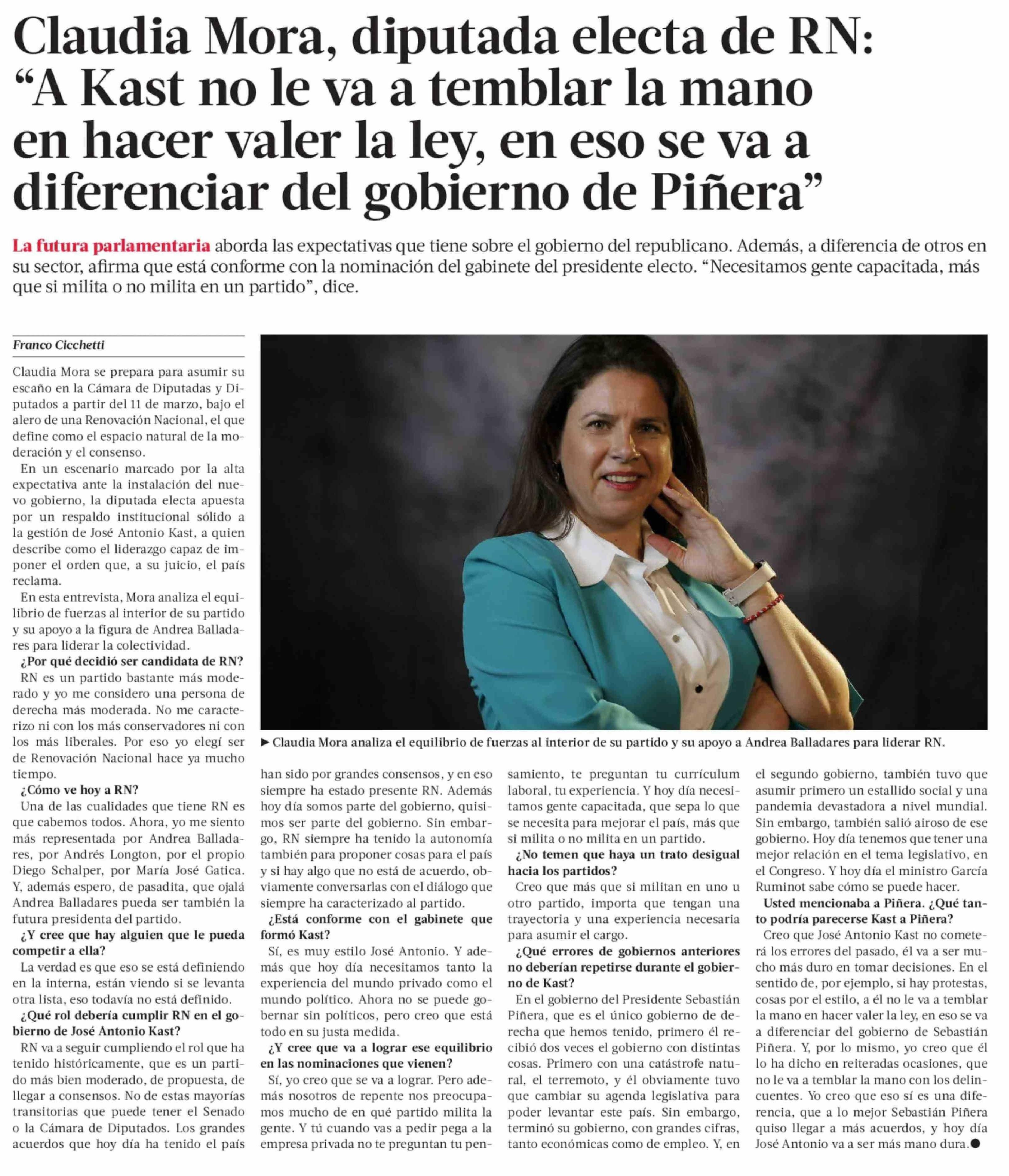 | Título: | Claudia Mora, diputada electa de RN: "A Kast no le va a temblar la mano en hacer valer la ley, en eso se va a diferenciar del gobierno de Piñera" |
