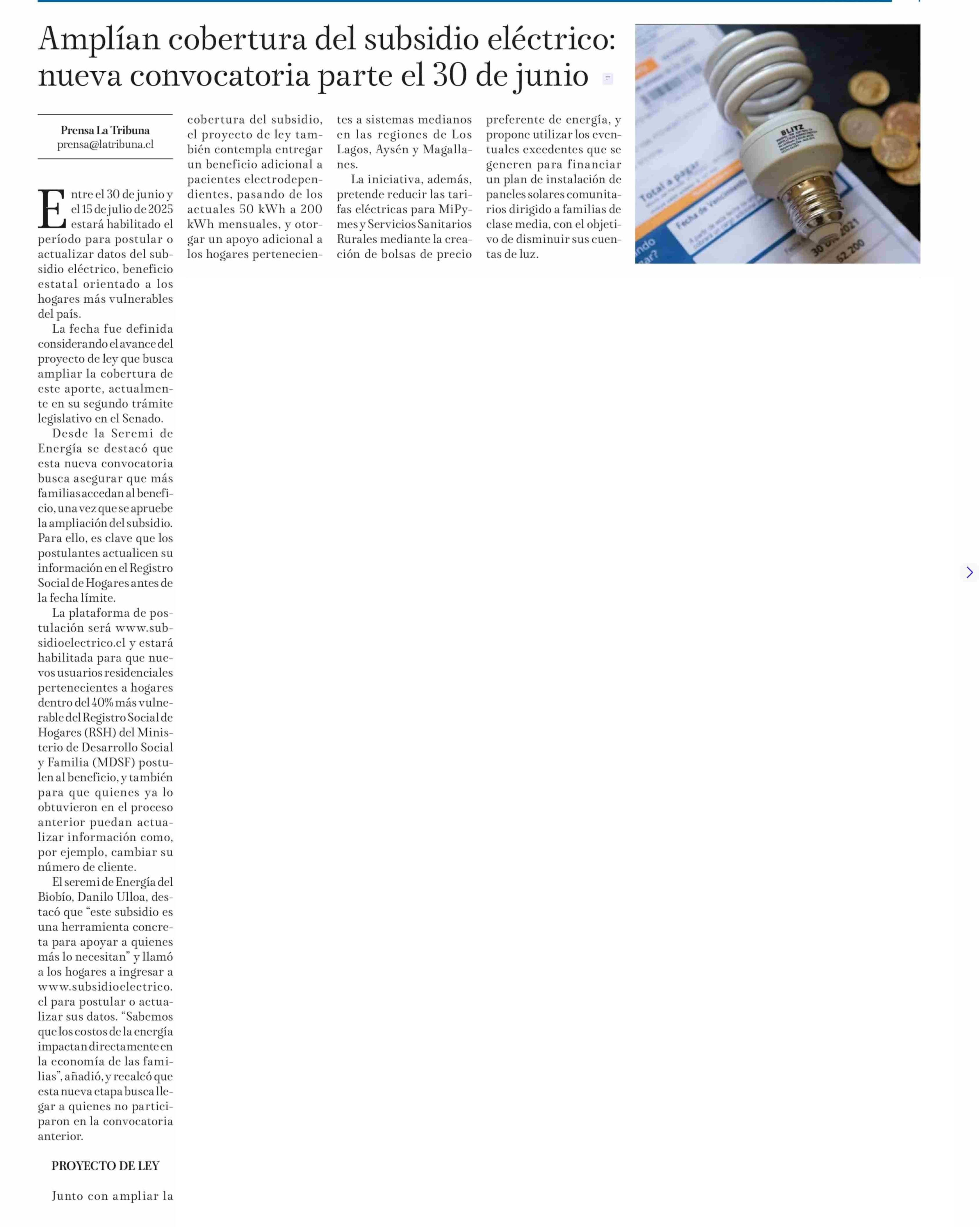 Amplían cobertura del subsidio eléctrico: nueva convocatoria parte el 30 de junio 09-06-2025 La Tribuna |