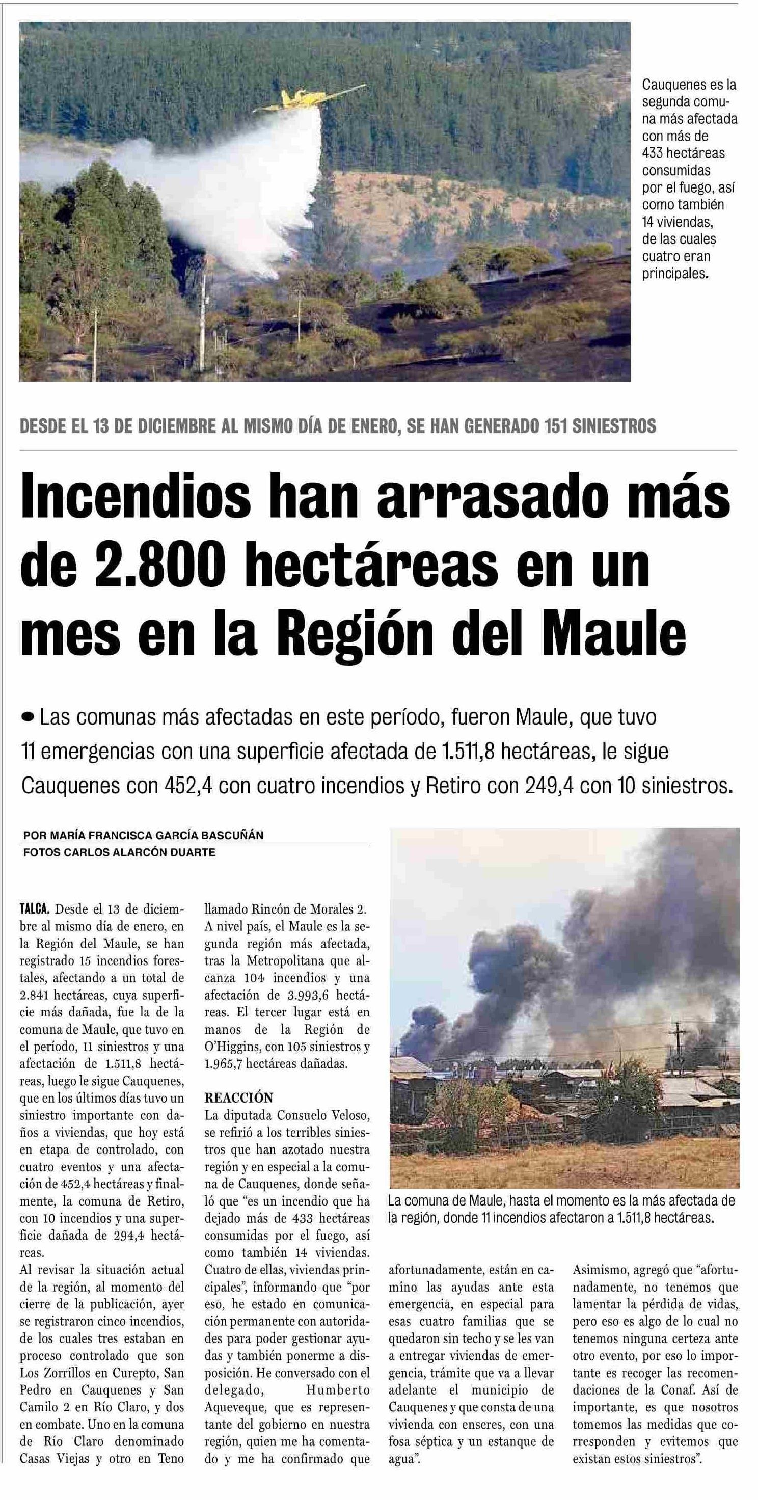 Incendios han arrasado más de 2.800 hectáreas en un mes en la Región del Maule 14-01-2026 La Prensa de Curicó |