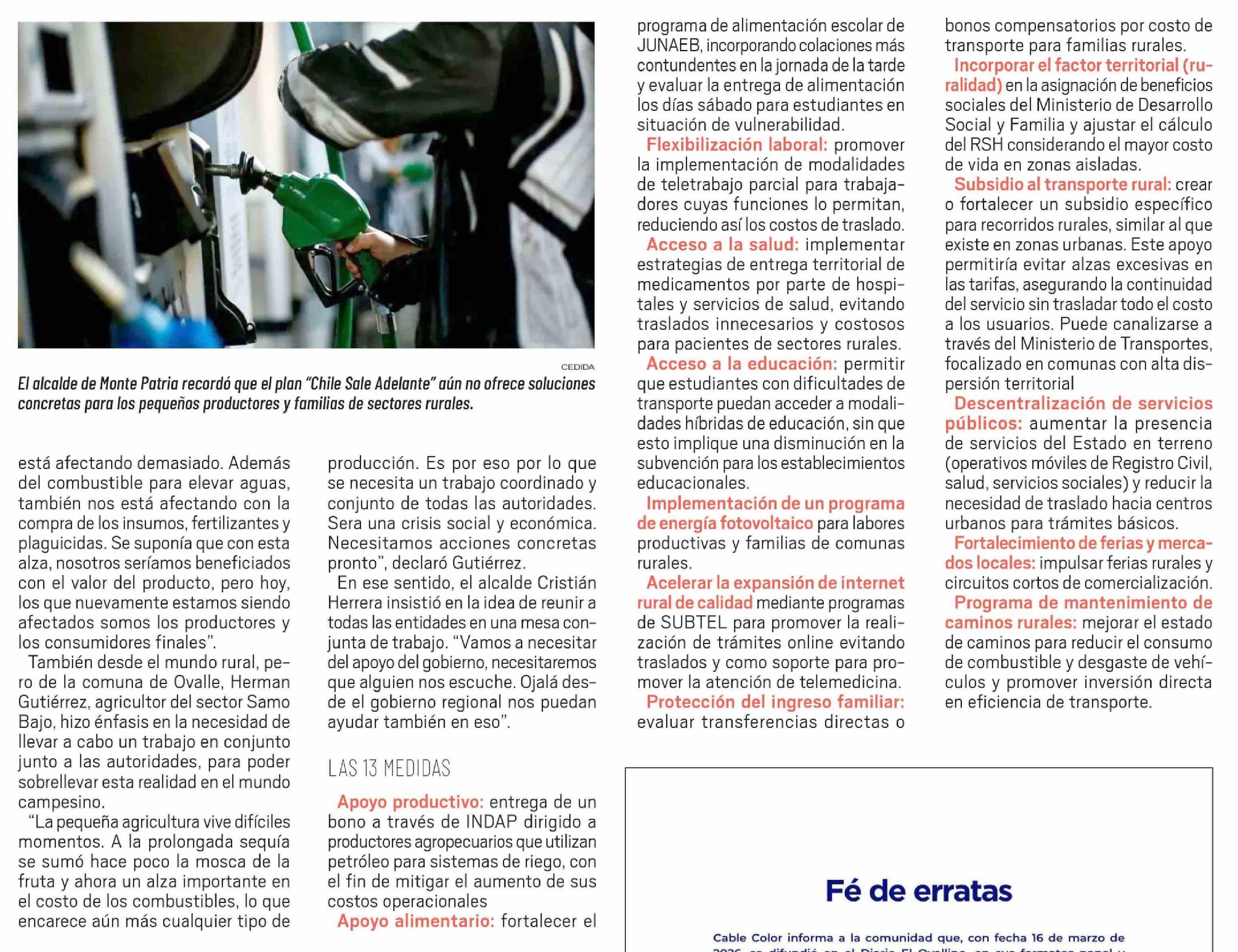 Proponen 13 medidas para enfrentar alza de bencina en zonas rurales 07-04-2026 El Ovallino |