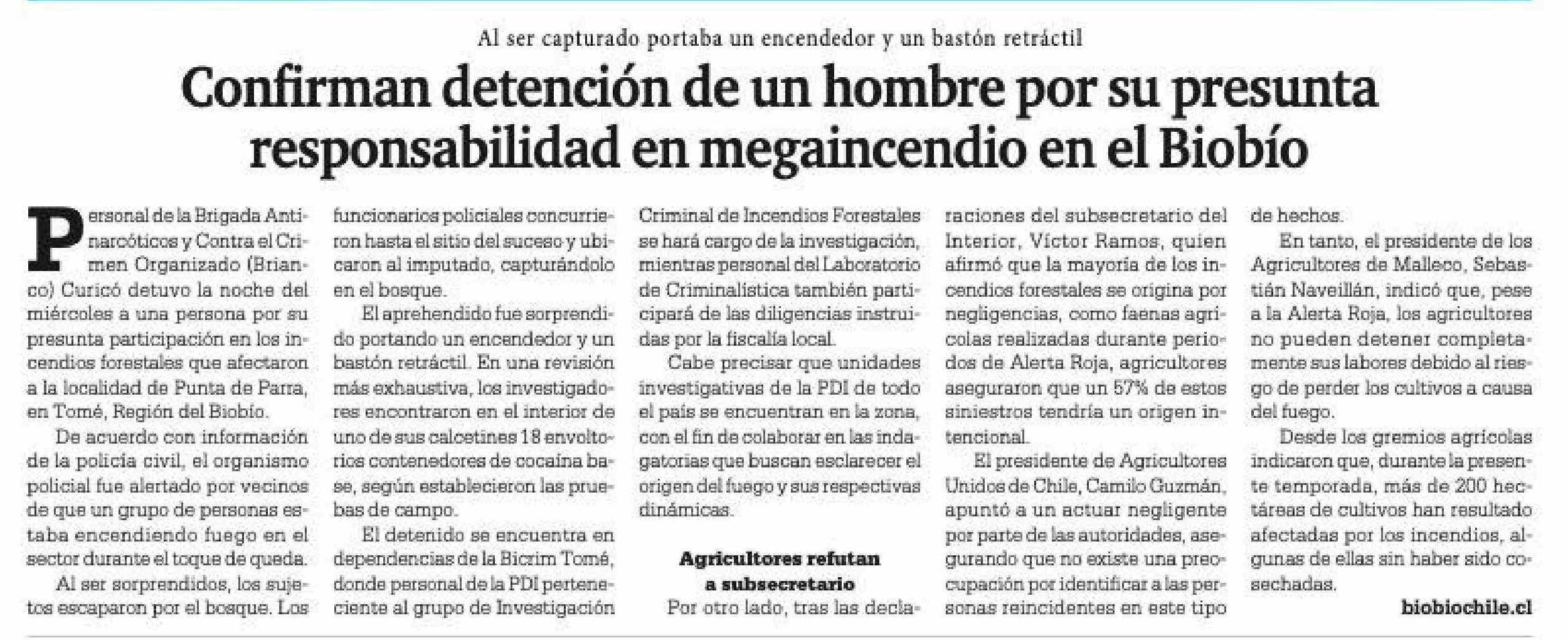 | Título: | Confirman detención de un hombre por su presunta responsabilidad en megaincendio en el Biobío |