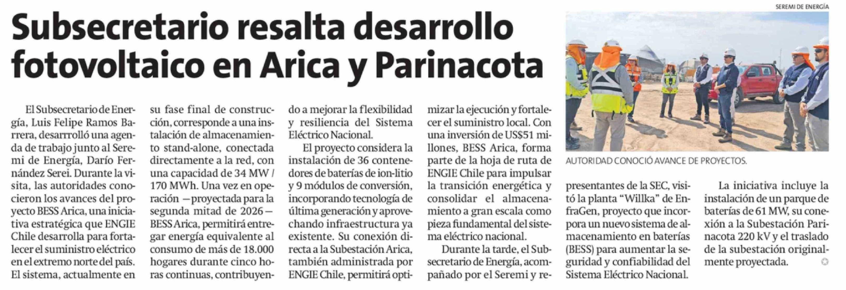 Subsecretario resalta desarrollo fotovoltaico en Arica y Parinacota 16-02-2026 La Estrella de Arica |