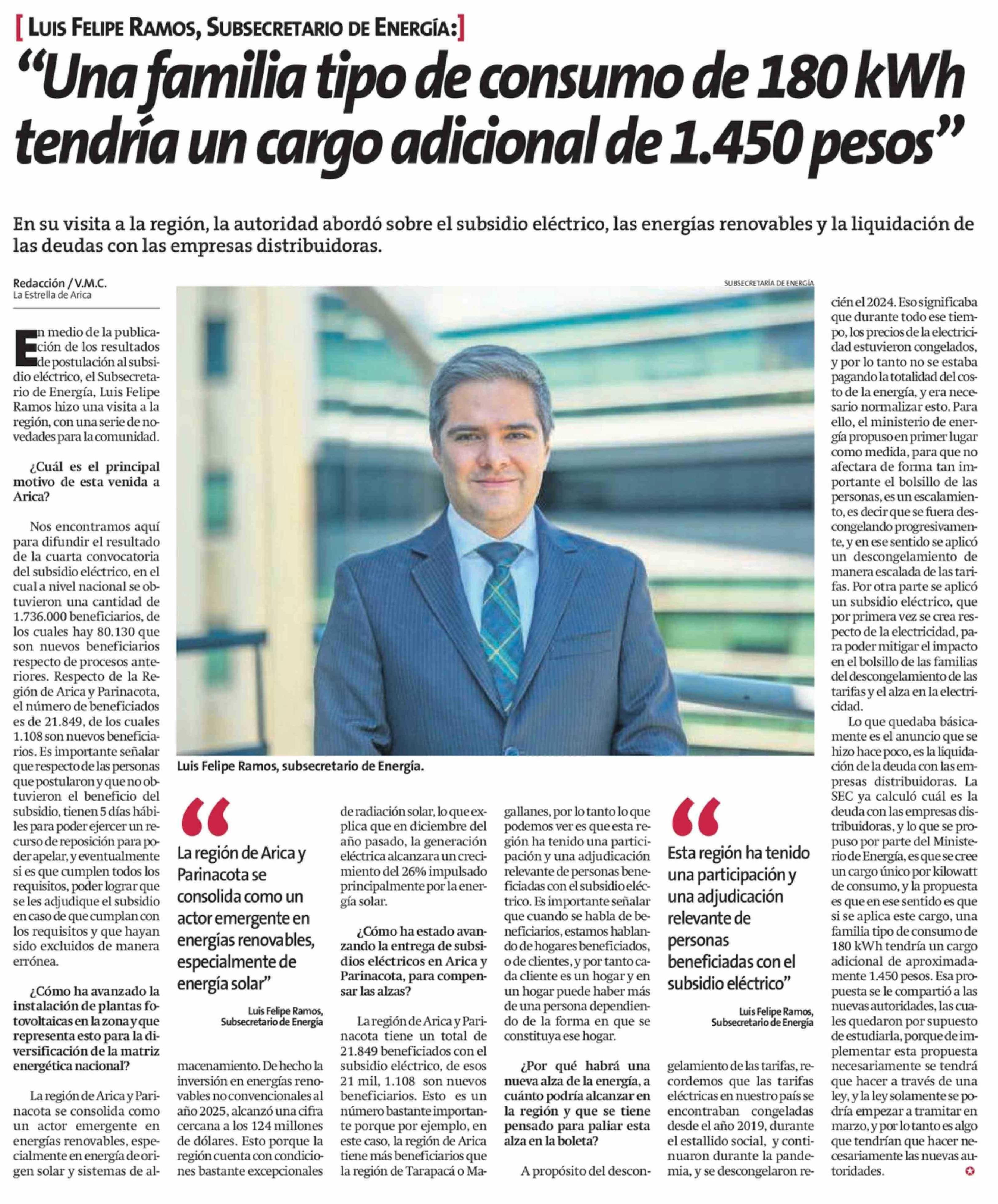 "Una familia tipo de consumo de 180 kWh tendría un cargo adicional de 1.450 pesos" 15-02-2026 La Estrella de Arica |
