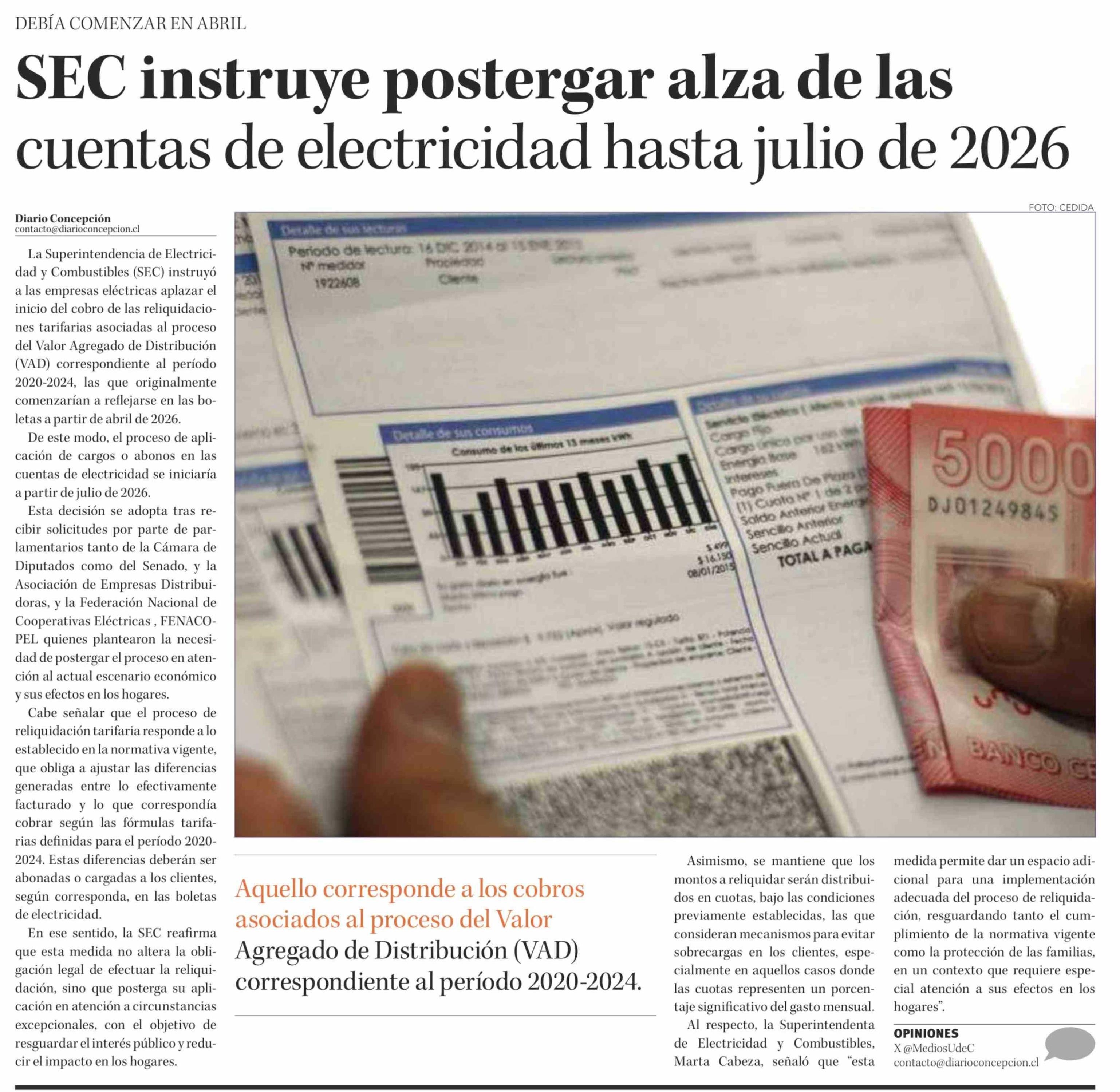 Título: SEC instruye postergar alza de las cuentas de electricidad hasta julio de 2026