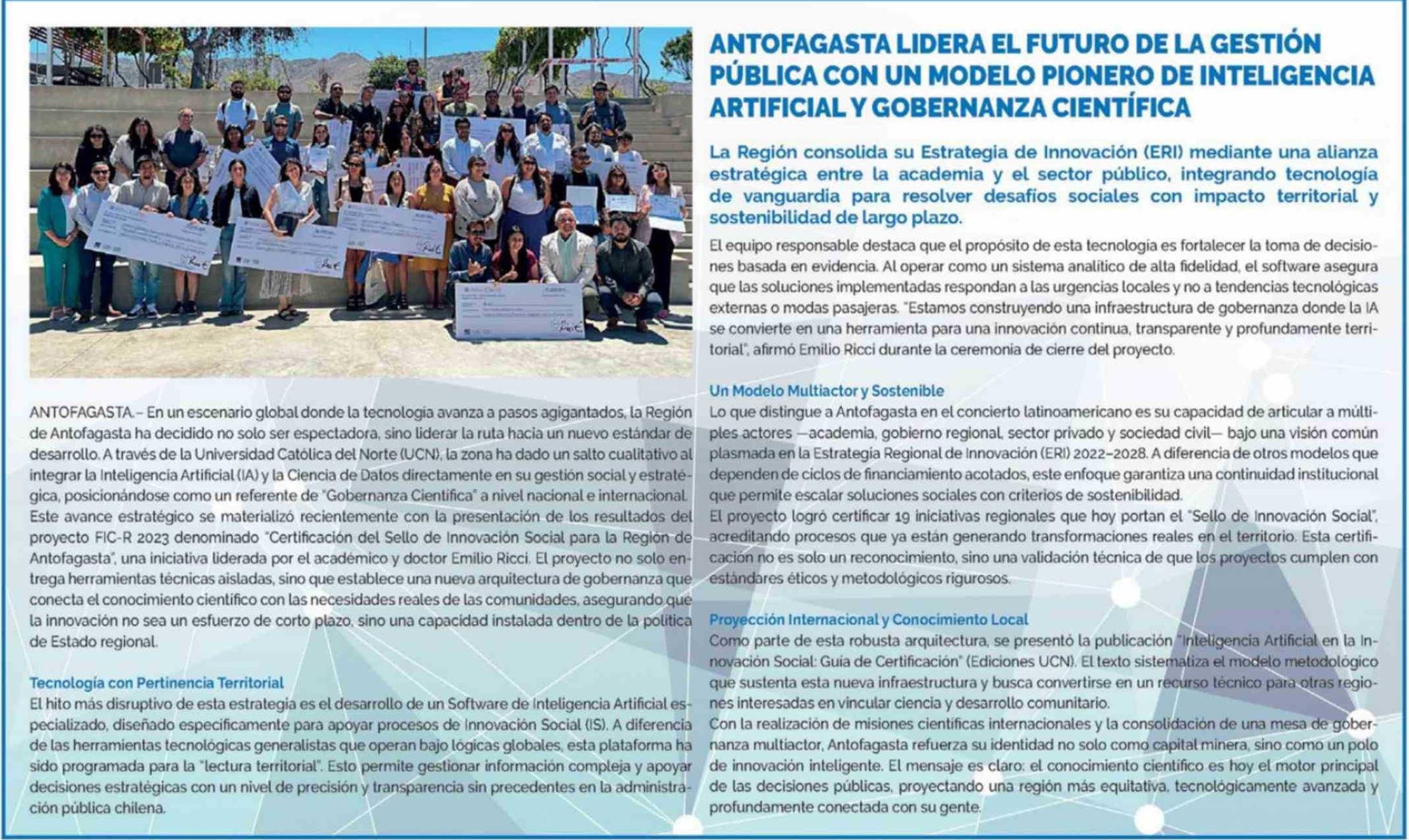 ANTOFAGASTA LIDERA EL FUTURO DE LA GESTIÓN PÚBLICA CON UN MODELO PIONERO DE INTELIGENCIA ARTIFICIAL Y GOBERNANZA CIENTÍFICA La Región consolida su Estrategia de Innovación (ERI) mediante una alianza estratégica entre la academia y el sector público, integrando tecnología de vanguardia para resolver