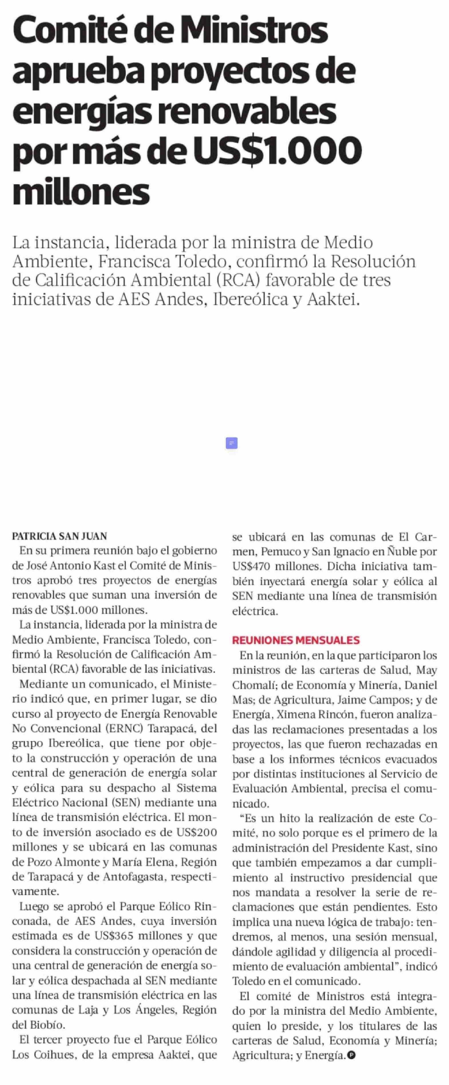 Comité de Ministros aprueba proyectos de energías renovables por más de US$1.000 millones 31-03-2026 La Tercera |