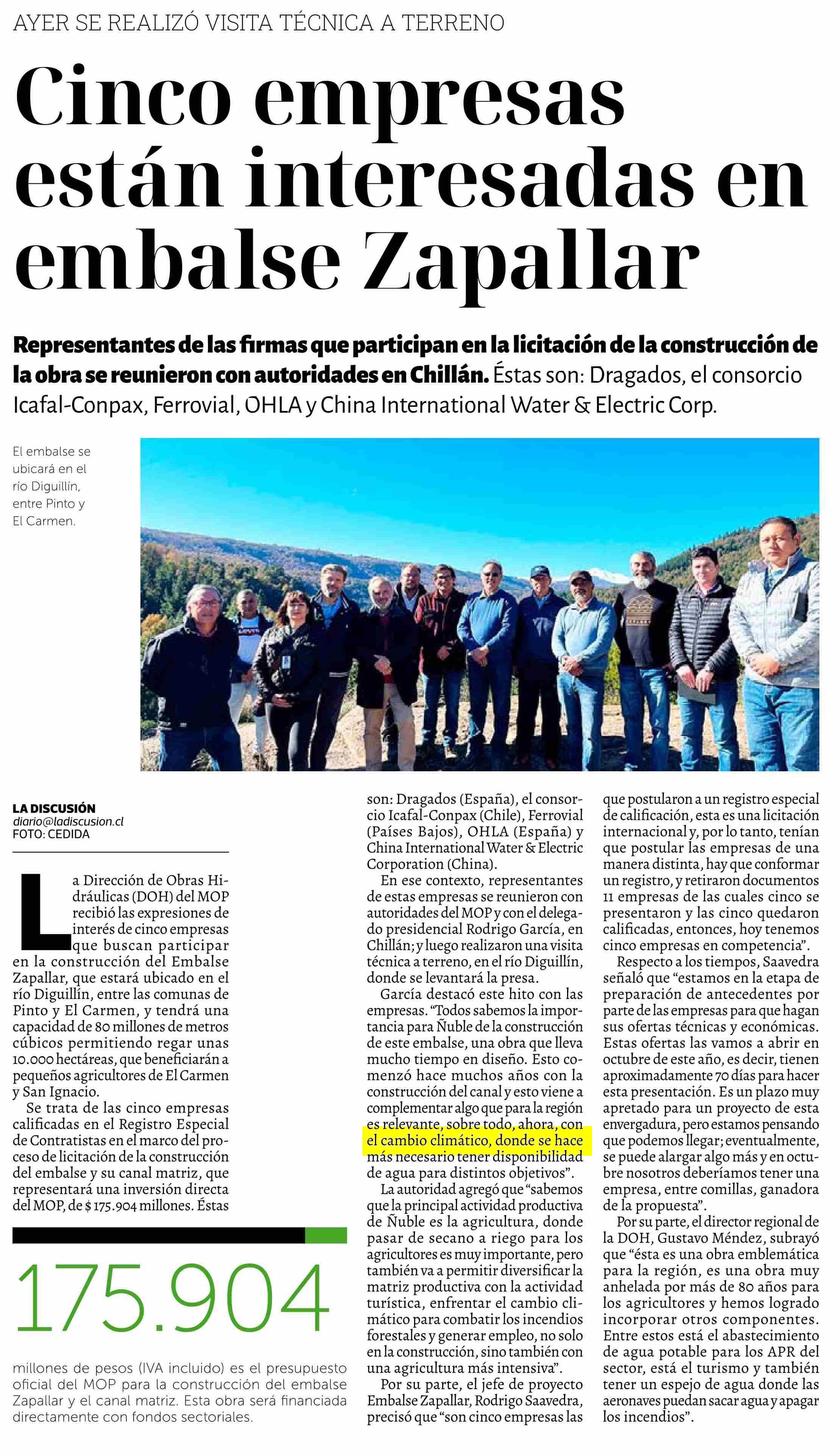 Cinco empresas están interesadas en embalse Zapallar 31-05-2025 La Discusión |