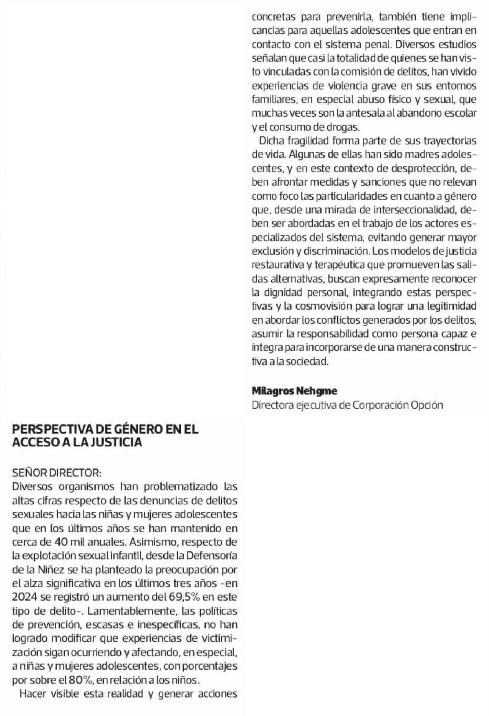 Cartas: PERSPECTIVA DE GÉNERO EN EL ACCESO A LA JUSTICIA 13-03-2026 La Tercera |
