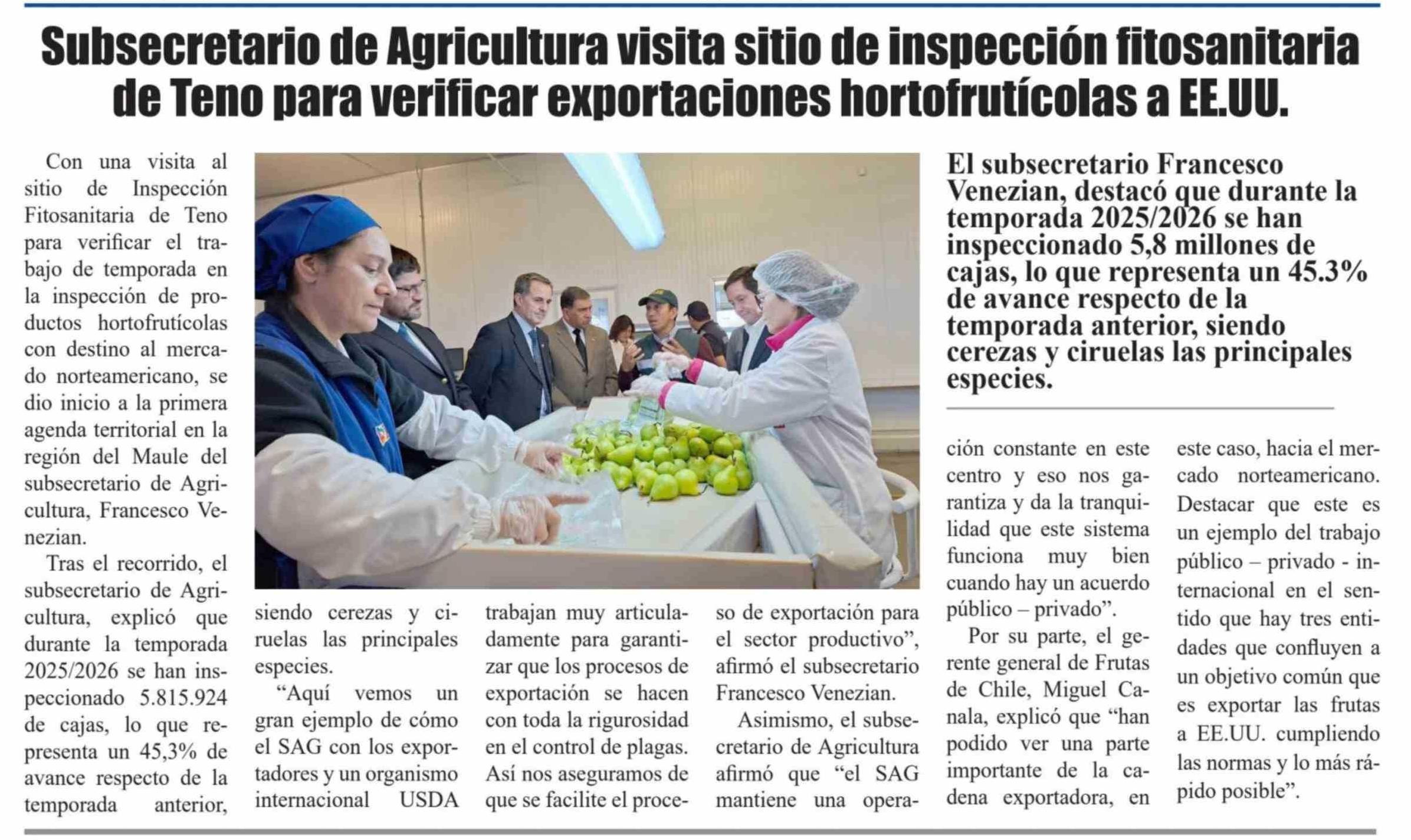 Título: Subsecretario de Agricultura visita sitio de inspección fitosanitaria de Teno para verificar exportaciones hortofrutícolas a EE.UU.