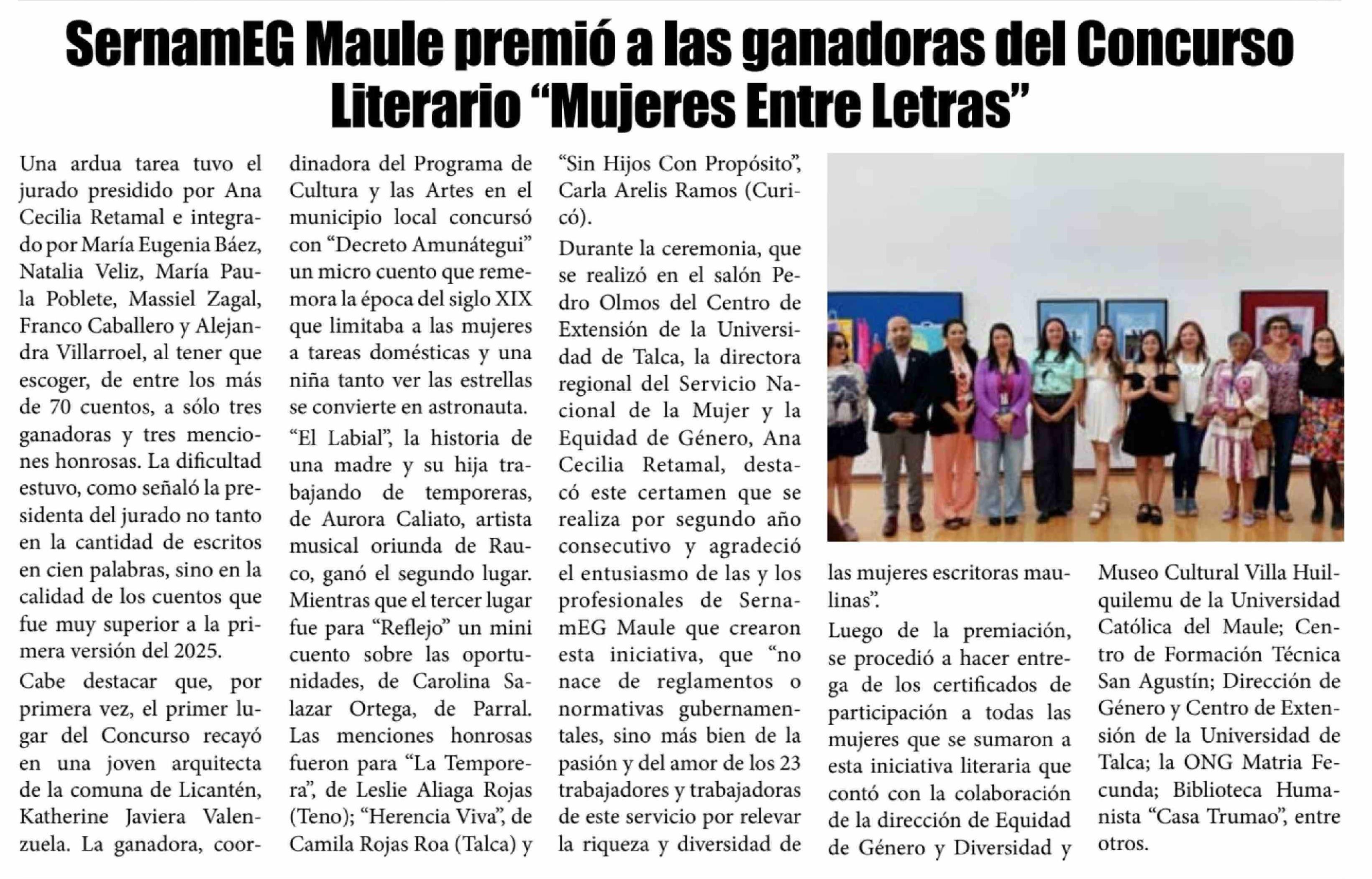 SernamEG Maule premio a las ganadoras del Concurso Literario "Mujeres Entre Letras" 18-03-2026 El Lector |