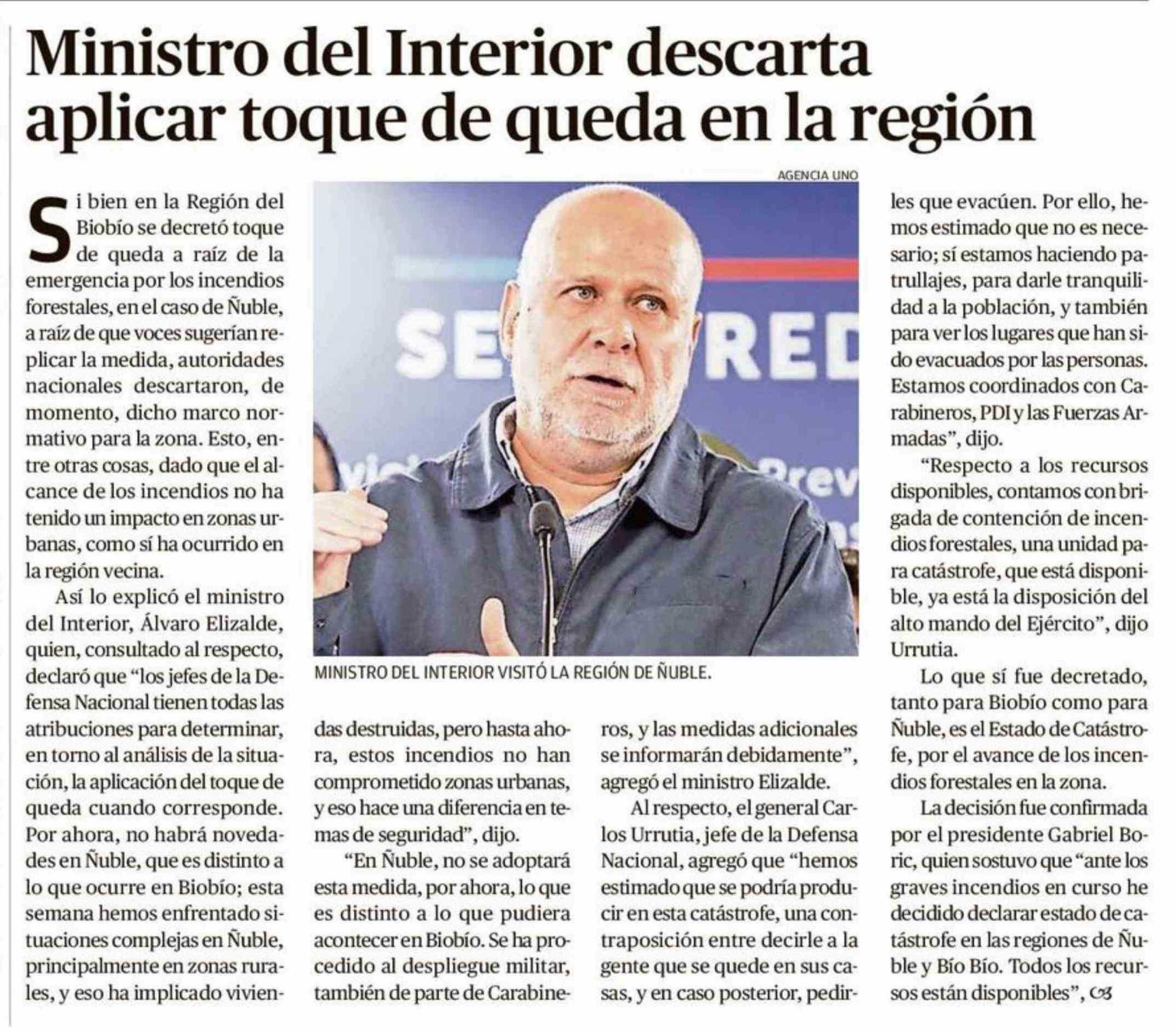 Ministro del Interior descarta aplicar toque de queda en la región 19-01-2026 Crónica de Chillán |