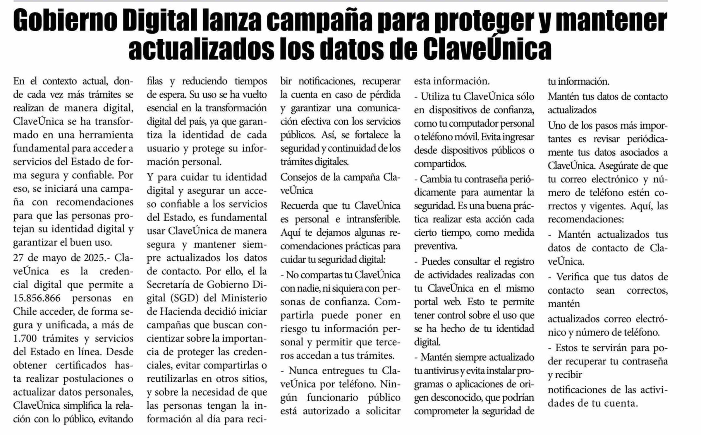 Gobierno Digital lanza campaña para proteger y mantener actualizados los datos de ClaveUnica 29-05-2025 El Lector |