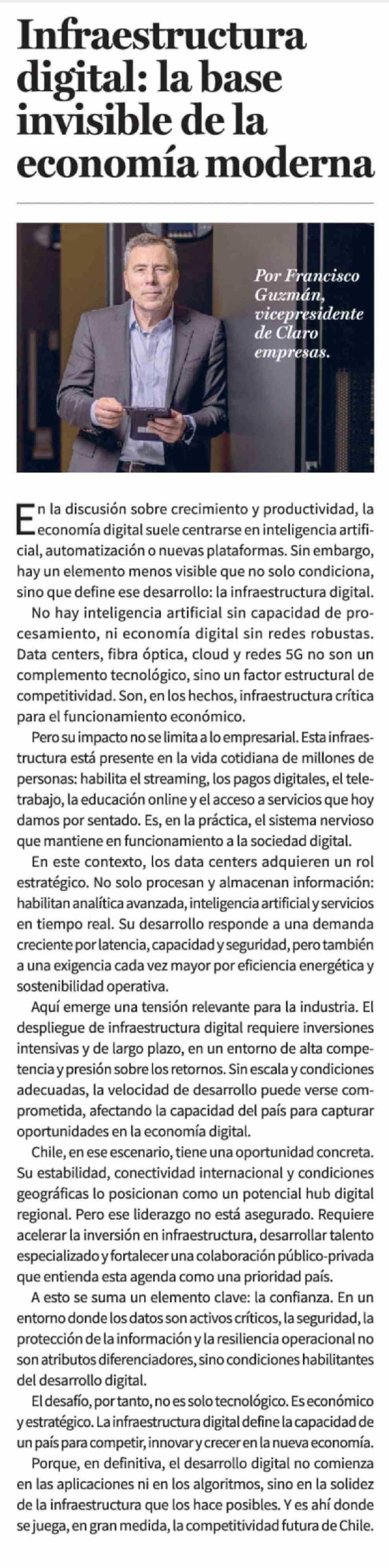 Columnas de Opinión: Infraestructura digital: la base invisible de la economía moderna 29-03-2026 La Tercera |