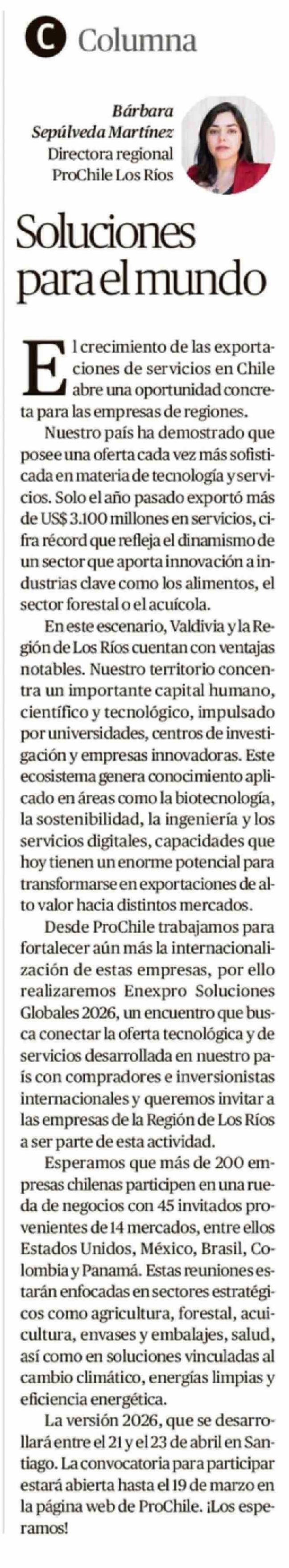 Columnas de Opinión: Soluciones para el mundo 15-03-2026 Diario Austral Región de Los Ríos |