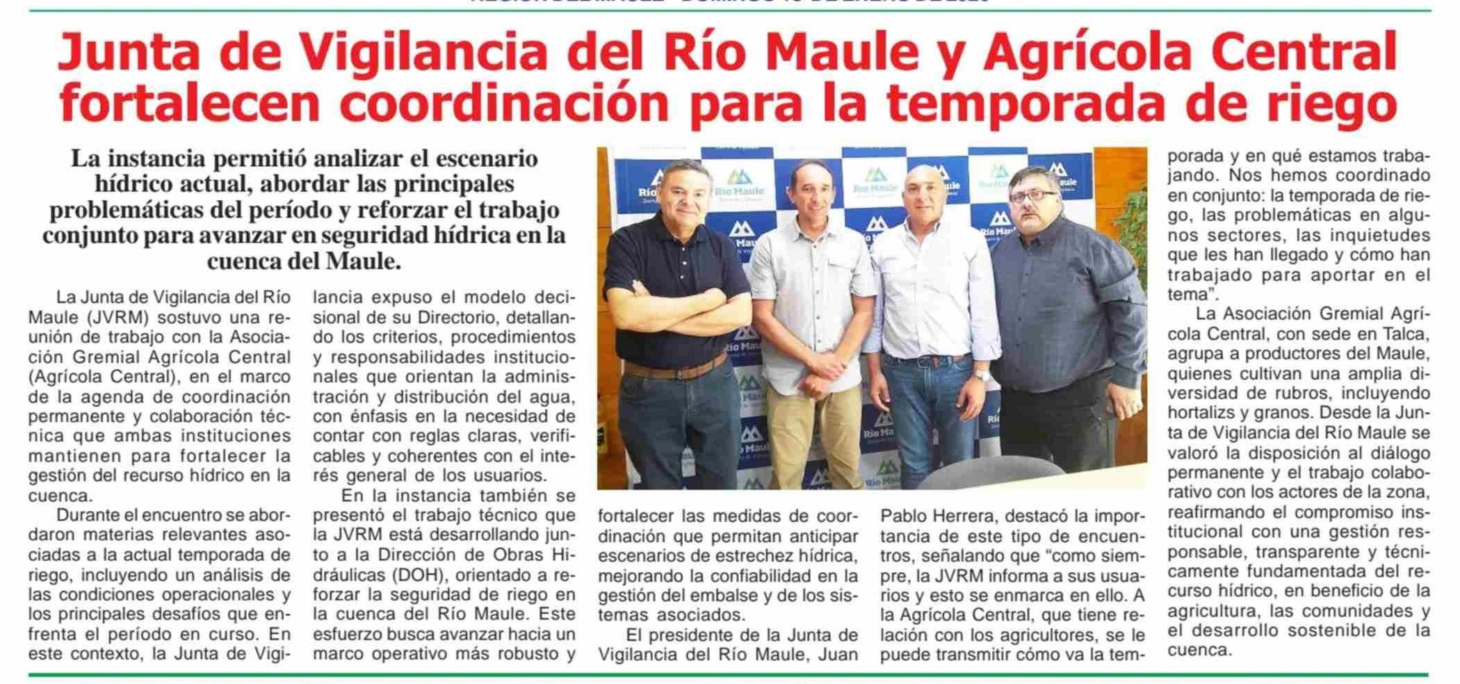 Junta de Vigilancia del Río Maule y Agrícola Central fortalecen coordinación para la temporada de riego 18-01-2026 Maule Hoy |