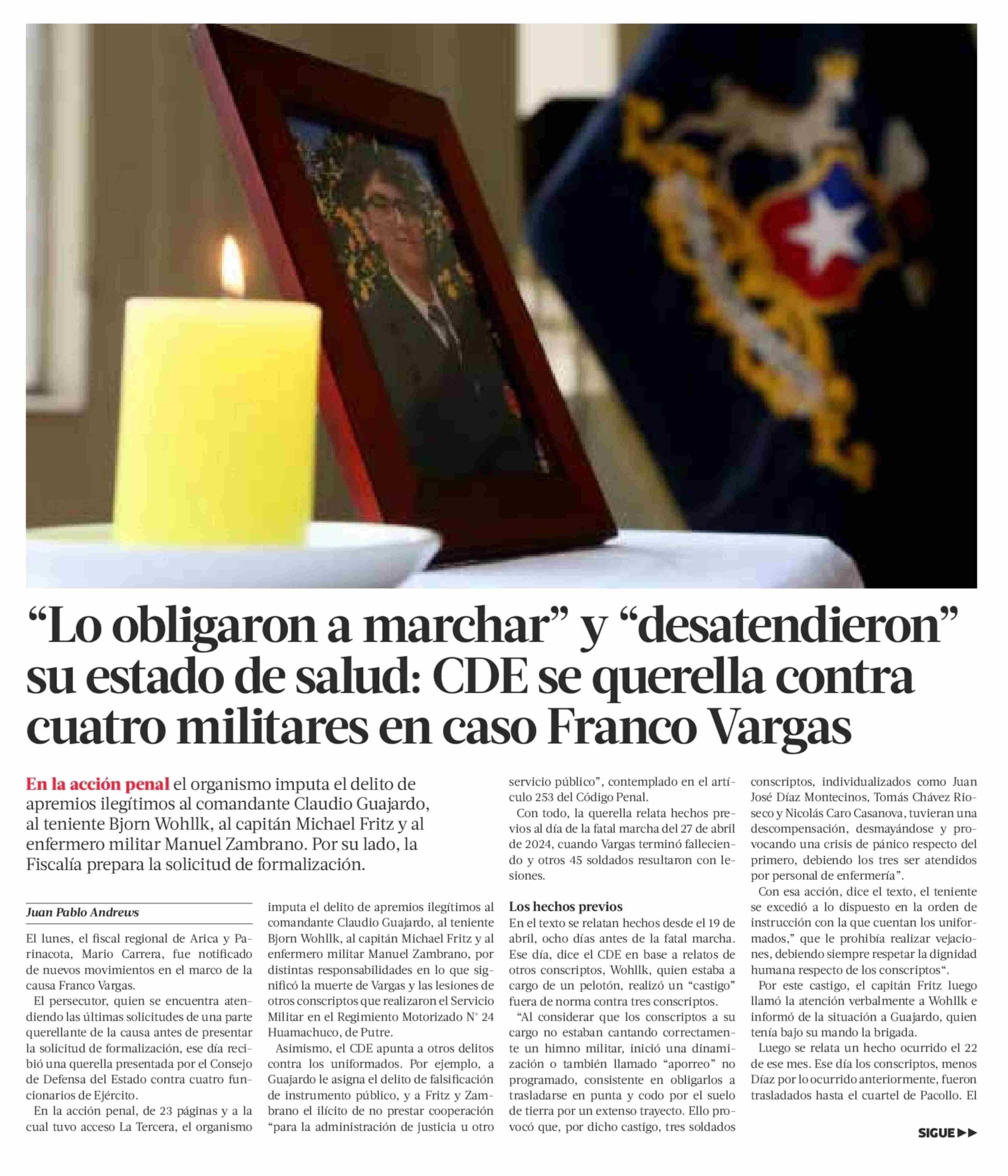 “Lo obligaron a marchar” y “desatendieron” su estado de salud: CDE se querella contra cuatro militares en caso Franco Vargas 05-06-2025 La Tercera |