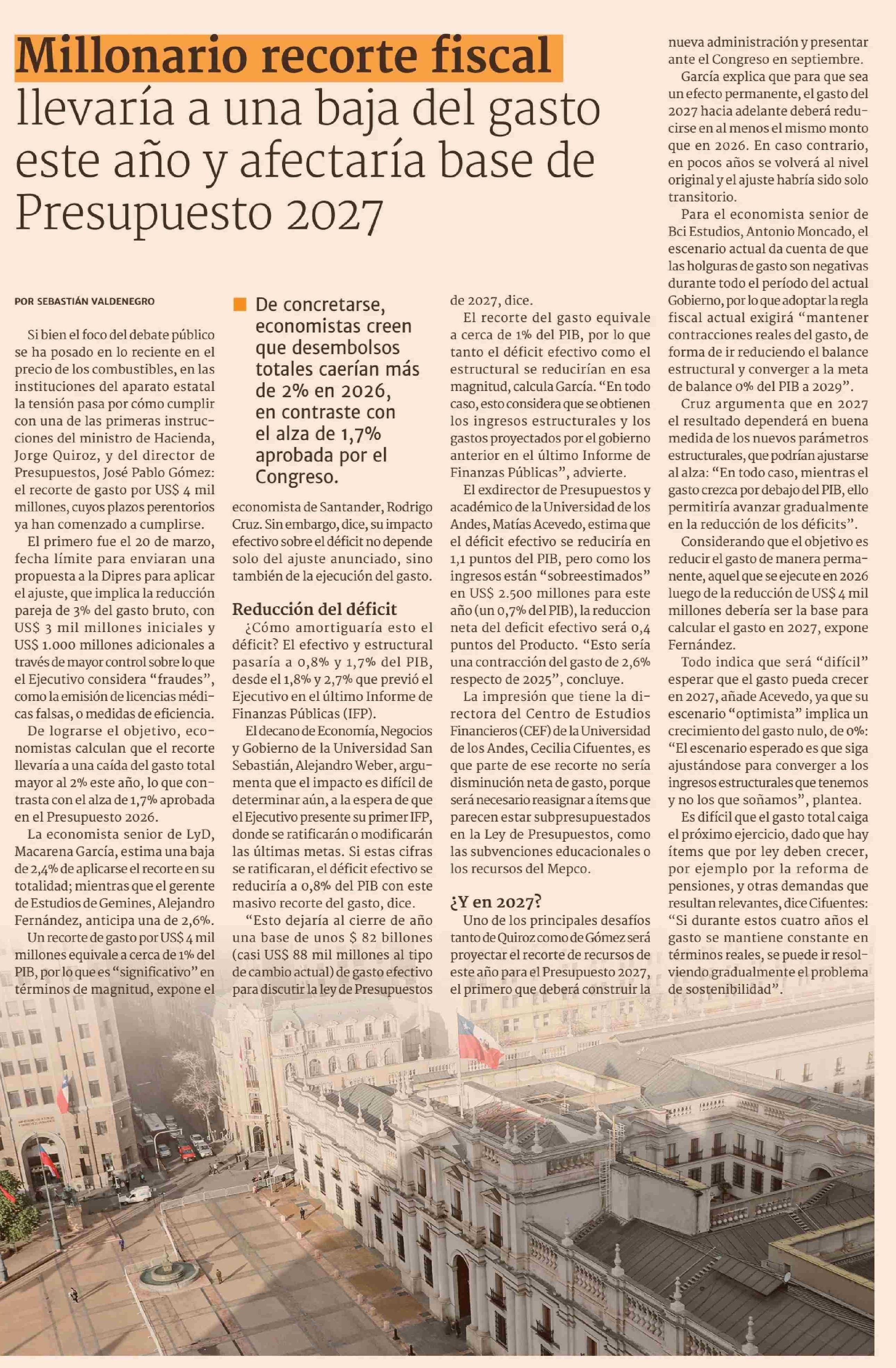 Millonario recorte discal llevaría a una baja del gasto este año y afectaría base de Presupuesto 2027 31-03-2026 Diario Financiero |