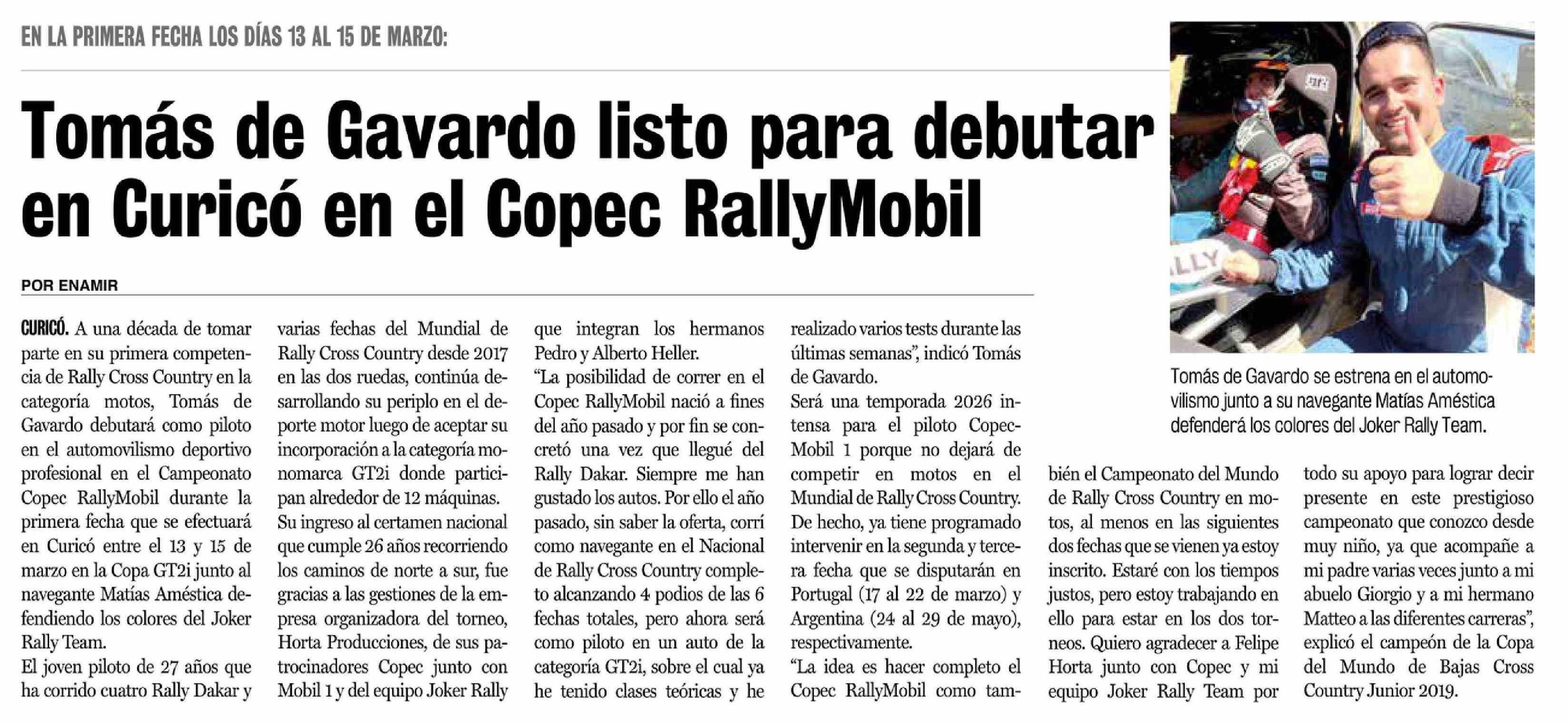 | Título: | Tomás de Gavardo listo para debutar en Curicó en el Copec RallyMobil |