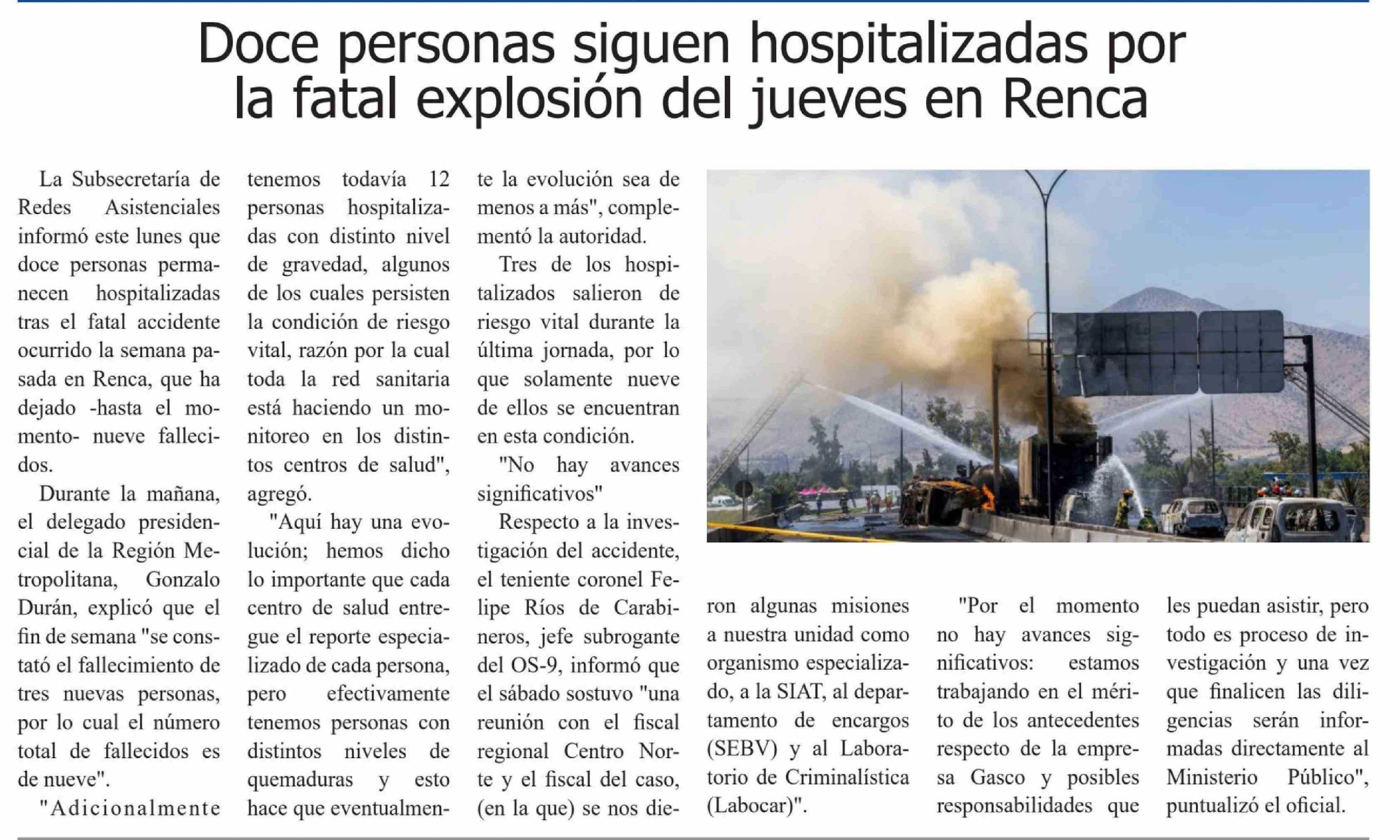| Título: | Doce personas siguen hospitalizadas por la fatal explosión del jueves en Renca |