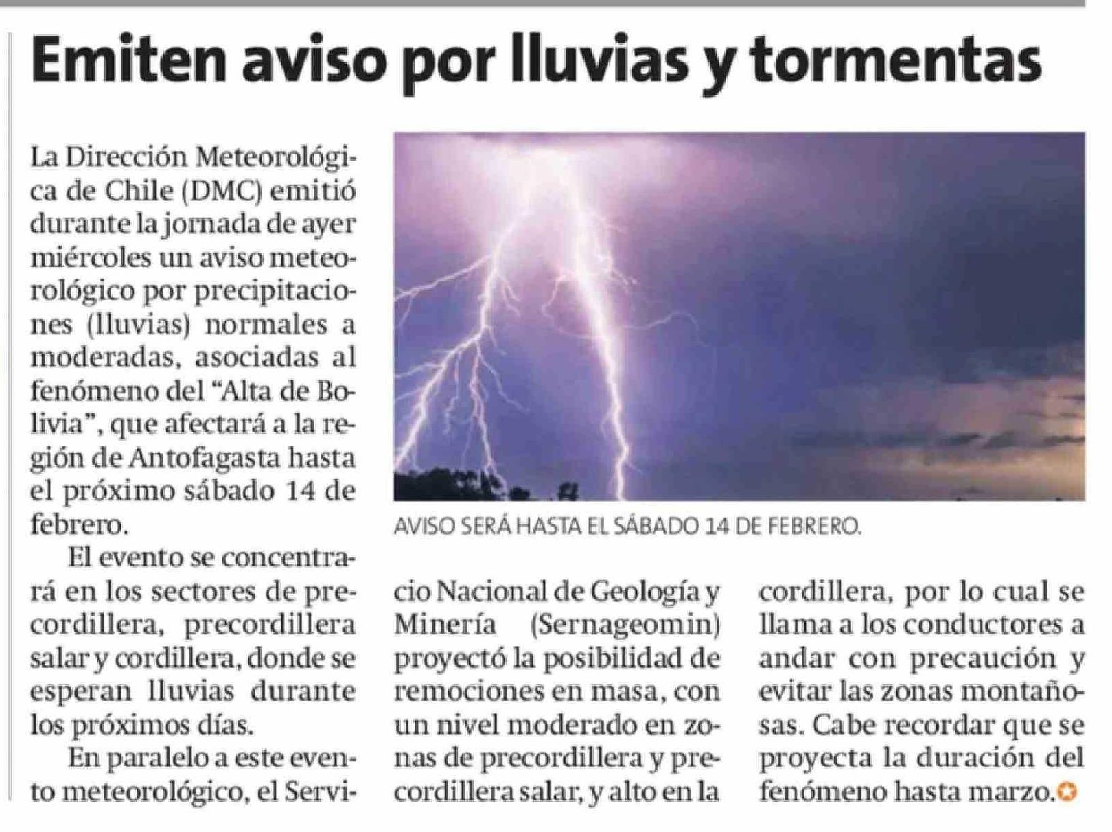 Emiten aviso por lluvias y tormentas 12-02-2026 La Estrella de Antofagasta |