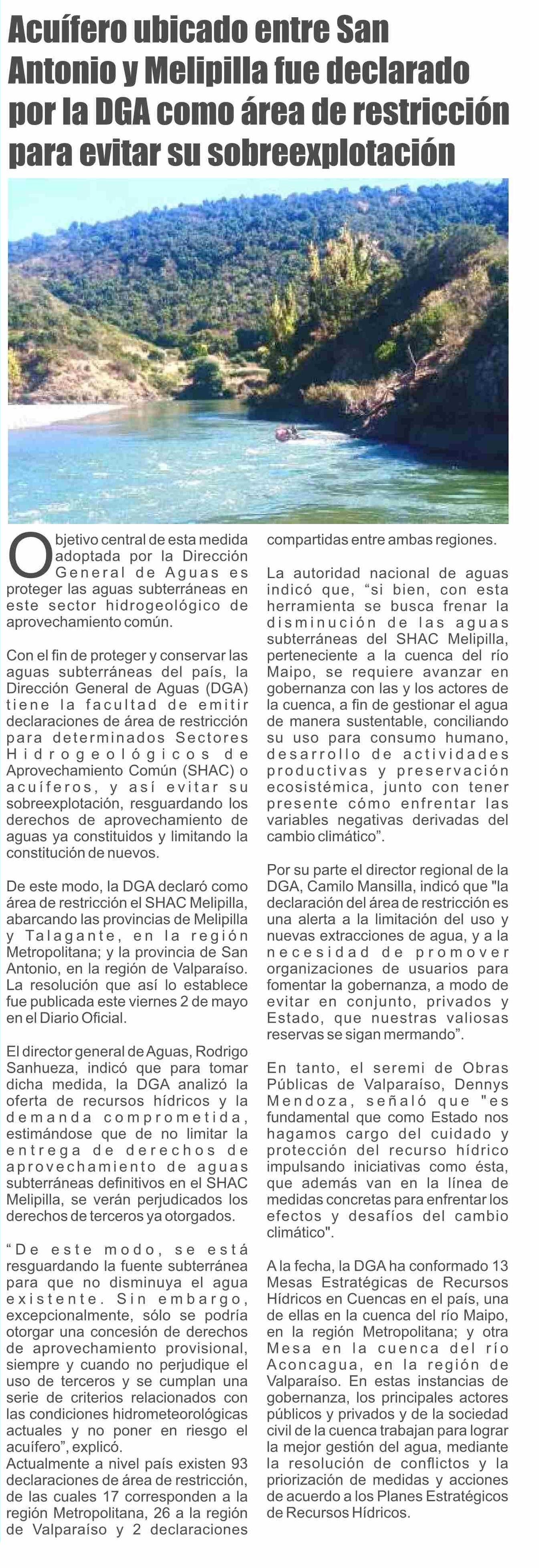 | Título: | Acuífero ubicado entre San Antonio y Melipilla fue declarado por la DGA como área de restricción para evitar su sobreexplotación |