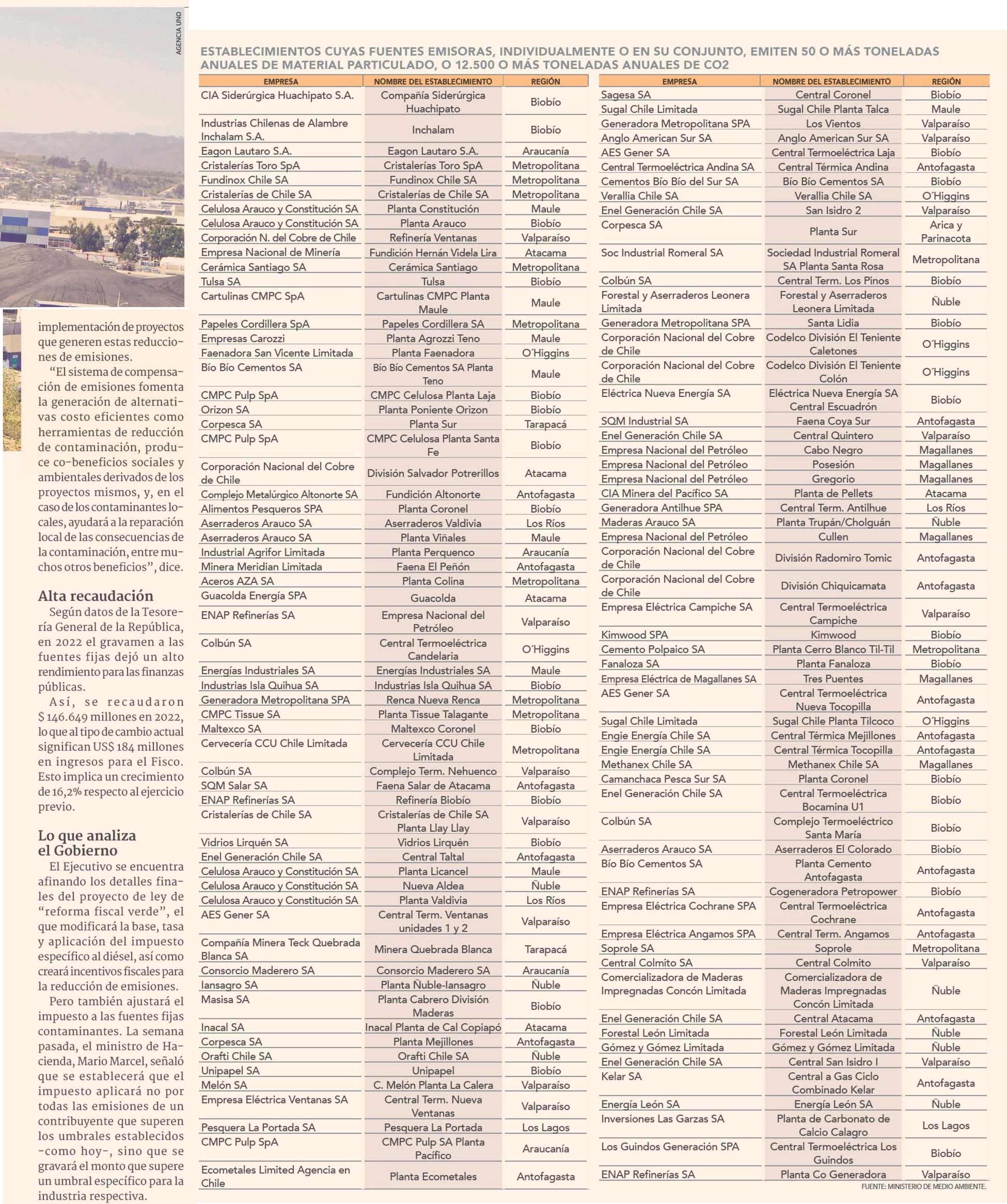 Aumentan a casi 120 los establecimientos contaminantes que estarían afectos al impuesto verde en 2023 17-04-2023 Diario Financiero |
