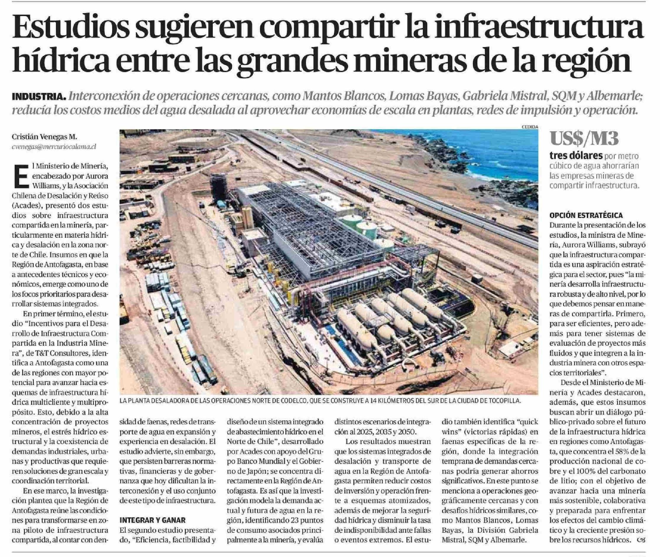 Estudios sugieren compartir la infraestructura hídrica entre las grandes mineras de la región 21-01-2026 El Mercurio de Calama |