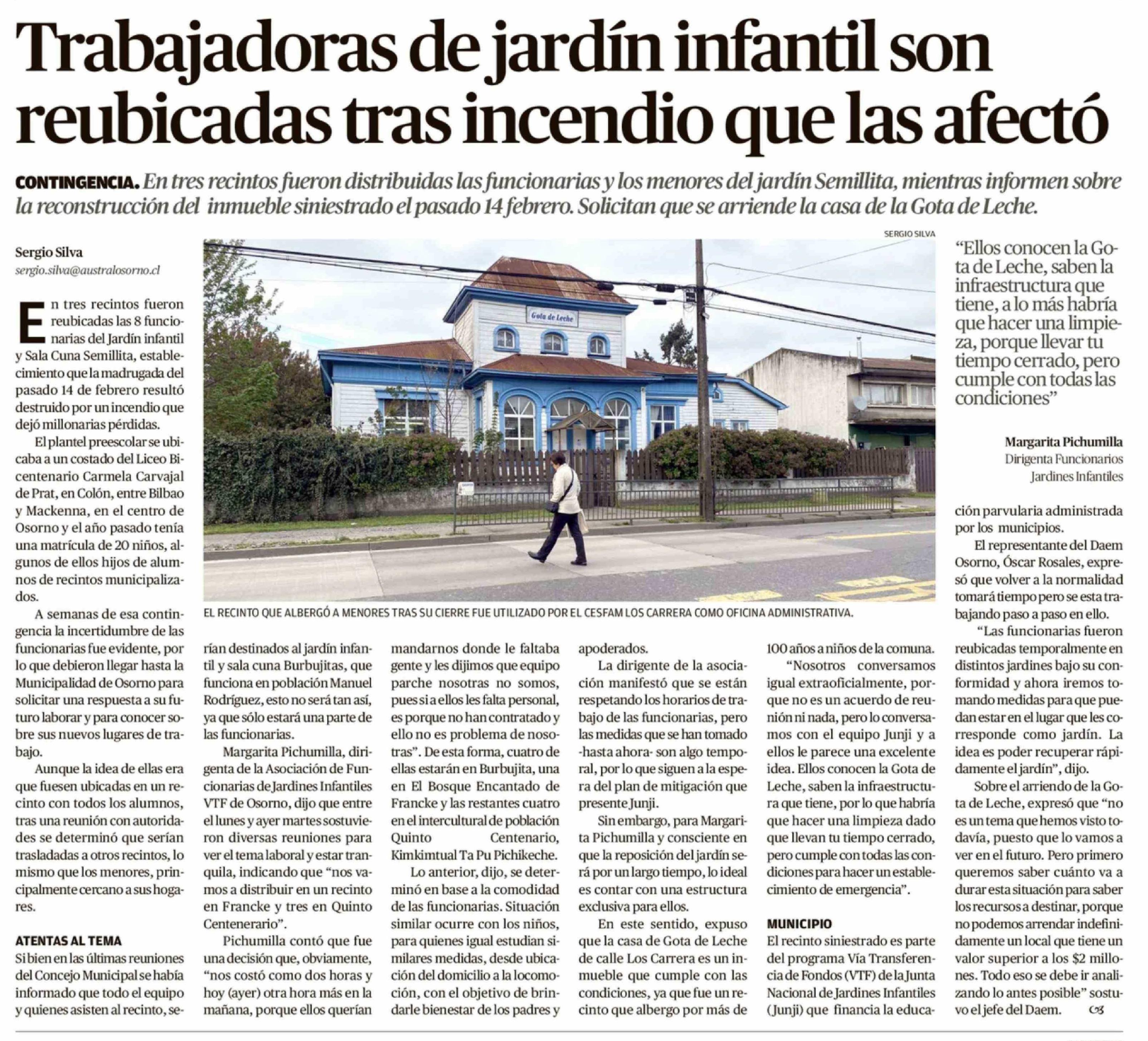 Trabajadoras de jardín infantil son reubicadas tras incendio que las afectó 04-03-2026 El Austral de Osorno |